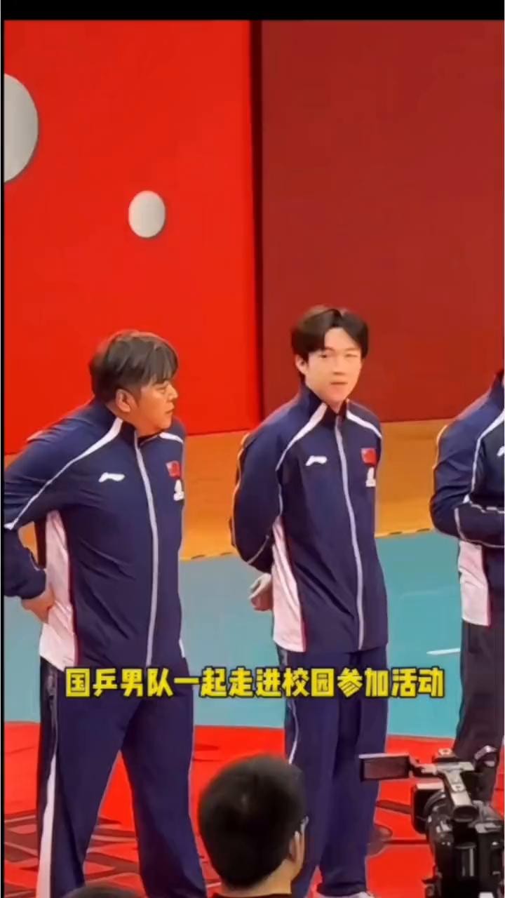国乒男队一起走进校园参加活动,几个人不知道看什么这么入迷。上台互动环节,跟小朋友对练中,最后与领导切磋两下。