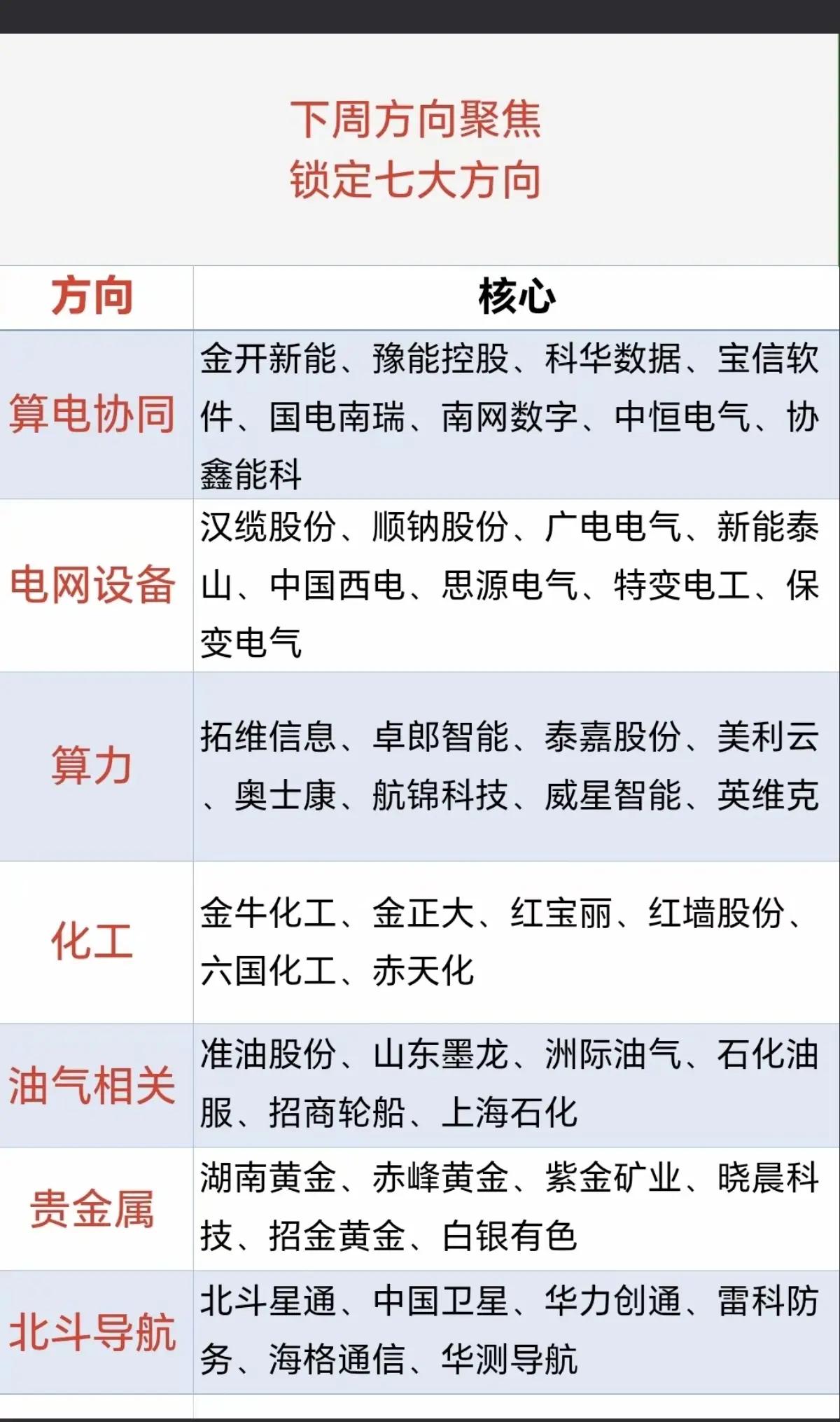 3.09周策略:七大主线聚焦,电力与科技成核心锚点 下周市场资金聚焦七大方向,算电协同与电网设备形成最强联动主线,金开新能、汉缆股份等连板标的领衔,叠加南网数字等首板活跃股,资金博弈氛围浓厚。 算力板块作为科技分支延续强势,拓维信息、美利云等依托AI算力刚需,成为资金绕不开的方向。化工、油气板块受益于周期品价格预期,金牛化工、洲际油气等具备短线弹性。贵金属与北斗导航则作为防御与成长补充,在事件催化下存在轮动机会。 整体来看,市场主线清晰且呈现梯队效应,建议以算电协同为核心,兼顾算力与周期品的轮动机会,同时做好仓位管理应对板块分化!!!
