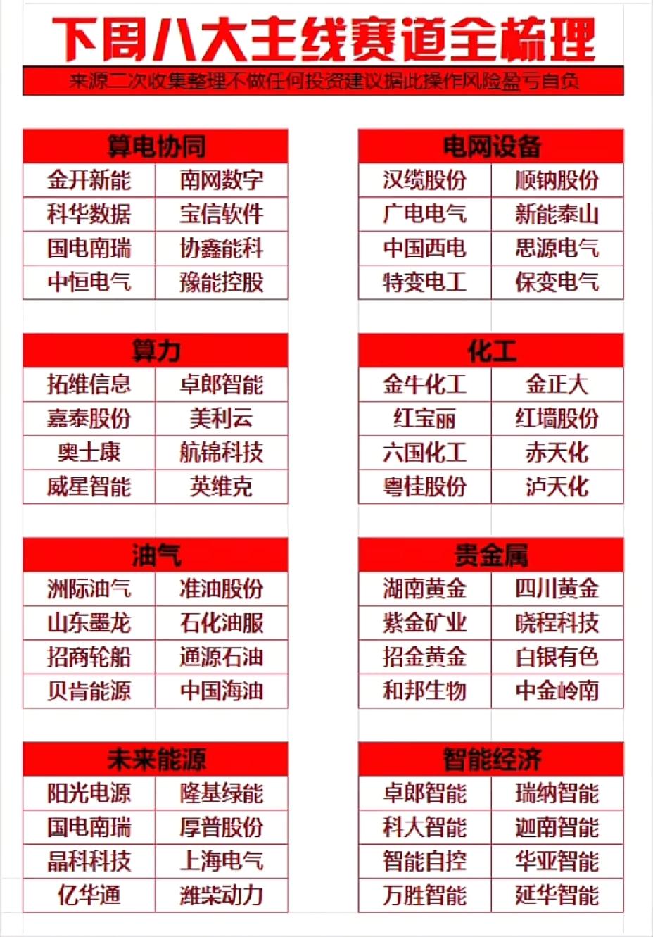 3.09周策略:八大主线重构,能源科技构筑行情骨架 下周市场八大主线清晰,算电协同与电网设备形成绝对核心,金开新能、汉缆股份等标的梯队完整,叠加未来能源板块的阳光电源、国电南瑞,能源电力系统的炒作逻辑持续深化。 算力与智能经济形成科技双翼,拓维信息、卓郎智能等标的覆盖AI算力与工业智能,成为资金进攻的弹性方向。周期板块呈现补涨态势,化工、油气、贵金属三线并行,金牛化工、洲际油气、紫金矿业等受益于价格预期与避险需求,具备轮动价值。 整体来看,市场呈现“能源为基、科技为翼、周期补涨”的格局,建议聚焦核心主线的龙头标的,同时关注板块间的资金轮动节奏,严控仓位应对分化!!!