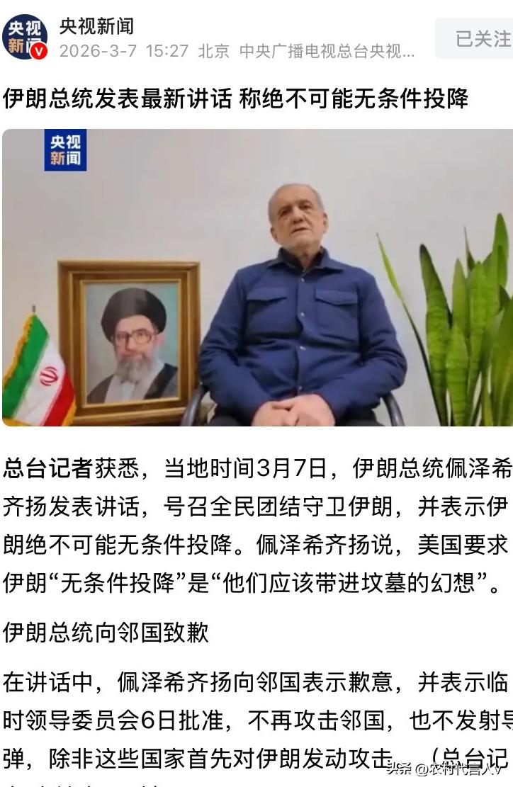 伊朗突然向邻国道歉,美以还在猛打,这事真不简单。 3月7号佩泽希齐扬一开口,有人以为伊朗怂了,其实当天就发了22轮火箭弹,还砸中了本-古里安机场的机库。他一边说“绝不投降”,一边对沙特、阿联酋、科威特低头认错,话还没说完,导弹已经飞出去了。这不是矛盾,是算得特别清楚的一步棋。 伊朗导弹之前打偏过好几次,炸到沙特炼油厂、阿联酋机场外围、科威特民用变电站。不是技术不行,是太忙了——既要盯以色列,又要防美军无人机,还得盯着伊拉克和叙利亚那几条补给线。结果一不留神,误击越来越多。海湾六国立马开会,说要是再有下一次,霍尔木兹海峡直接关门。真关了,伊朗油运不出去,连面粉都难进,更别说导弹零件。 这次道歉,表面是低头,其实是把火往一个方向烧。不打邻国了,防空雷达、侦察卫星、通信中继全调转方向,专盯着以色列。3月5号那一波“真实承诺-4”,第19轮打穿了三层防空网,连市中心地铁站都被震塌了。二十个目标里,十五个是美军在约旦、卡塔尔、巴林的基地,没碰一枪一炮在沙特或阿联酋境内。这不是收手,是换了个打法:打得更准,只打该打的。 最狠的一句,是伊朗军官在德黑兰内部会议里放的:“迪莫纳核设施只要被炸,60年没换过的反应堆会漏。”这话没上新闻,但传到了耶路撒冷。他们知道伊朗不是在吹牛——2月底试射的高超音速弹头,真在迪莫纳围墙外炸出了30米深坑。不是要引爆核弹,是要告诉对方:你要真动手,死的不光是伊朗人。 中俄这时候出来讲话,并没说“你们别打了”,也没帮谁调停。拉夫罗夫讲的是“美以想让阿拉伯人和伊朗撕破脸”,王毅说的是“海湾国家要发展,不能天天防导弹”。这两句话听着轻,但让伊朗的道歉立刻变了味——不是求饶,是响应邻居的安全需求。 安理会上中俄一起压下谴责伊朗的草案,却联手提出谴责以军越境袭击伊拉克边防哨所的决议。这不是站队,是给伊朗留了台阶,也给美以划了红线。 国内也没闲着。佩泽希齐扬这几天天天跑军工厂和导弹基地,但同时也在德黑兰大学开了场闭门会,改革派和保守派头头都在。大家意见居然一致:不能让老百姓连电都供不上,更不能让真主党在贝鲁特断了补给。道歉不是软,是把力气省下来,用在刀刃上。 海湾国家反应很快。3月8号早上,阿曼外长就发推说“欢迎任何建设性对话”,卡塔尔埃米尔取消了原定与美国防长的联合记者会。这些动作不声不响,但谁都看得懂:没人想被拖进一场没完没了的混战。伊朗的“止损”,真把别人的退路也一起保住了。 这事没那么复杂。就是一个人被围在中间,左边是拿着刀的,右边是举着盾的,他自己手里还有火。他先对右边的人说声对不起,不是怕,是怕打歪了伤着自己人。然后把所有子弹都对准左边那个。最后一句话:你再往前一步,整条街都得陪葬。 伊朗没投降,也没赢,只是重新摆好了姿势。 火还在烧,但方向清楚了,人还在。