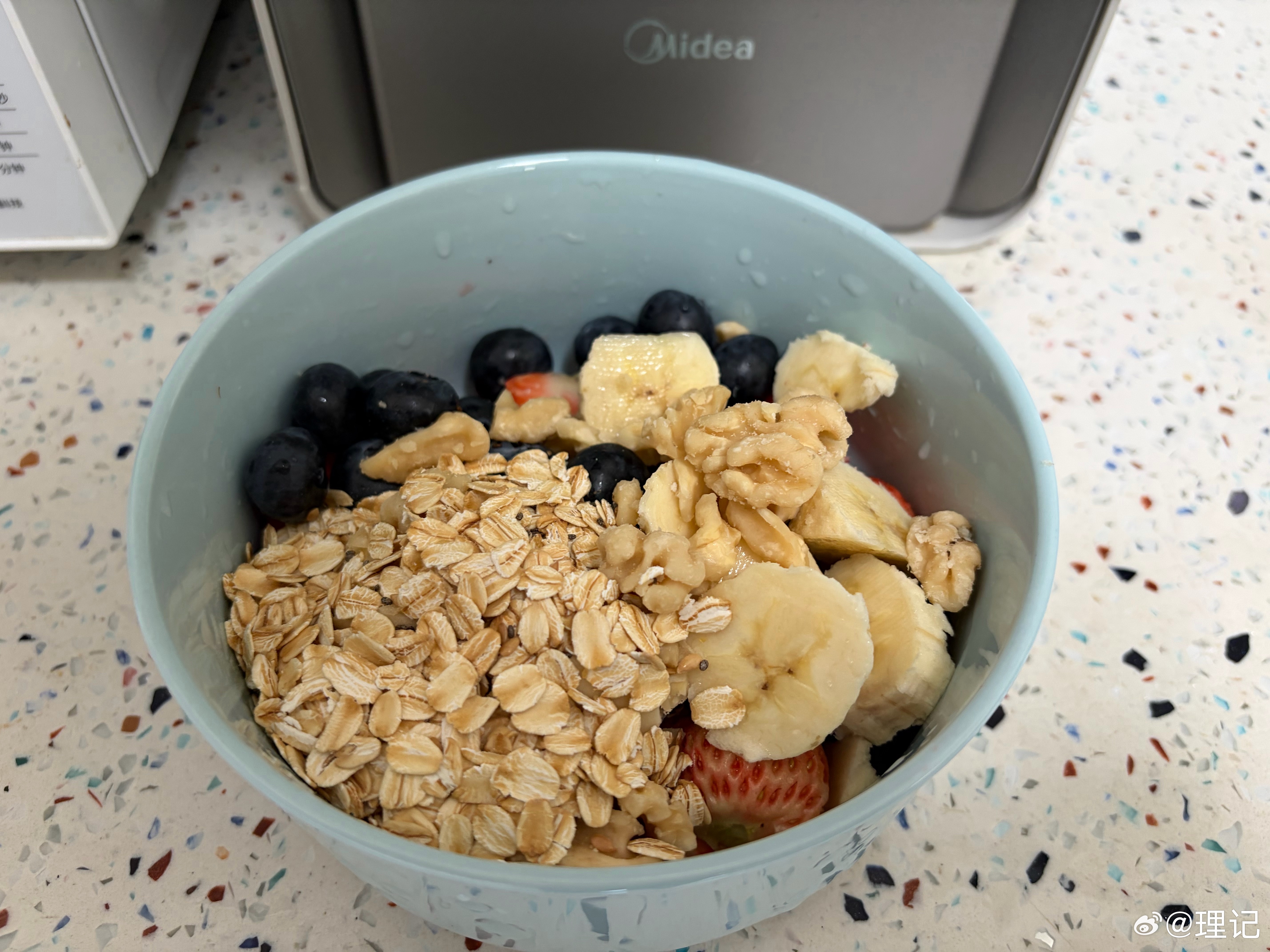 推荐一个我最爱吃的搭配。零糖酸奶,草莓六个,高纤维快熟燕麦片1-2勺,蓝莓十多个,香蕉三分之一根切片,低温烘烤非油炸核桃若干。