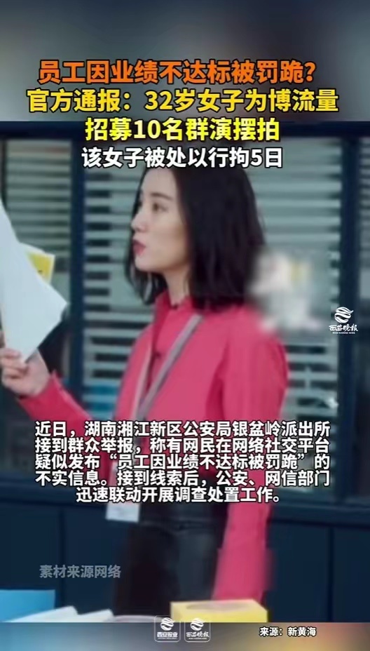 32岁女子为博流量,摆拍“员工因业绩不达标被罚跪”,被行拘5日。