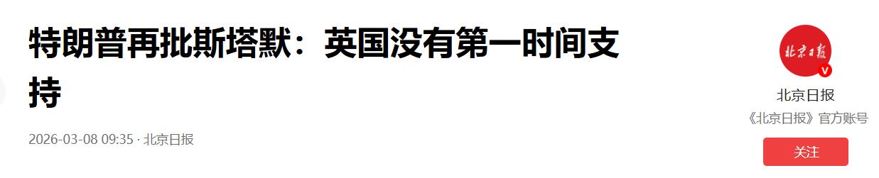 特朗普3月8日发文说:“英国,我们曾经的伟大盟友,或许是所有盟友中最伟大的,终于开始认真考虑向中东派遣两艘航空母舰。没关系,斯塔默首相,我们不再需要它们了——但我们会记住的。我们不需要那些在我们已经赢得战争之后才加入战争的人!——唐纳德·J·特朗普总统” 特朗普这话到底啥意思?好好的盟友,怎么说这种带刺的话?其实一点都不奇怪,特朗普这是憋了一肚子气,借这条发文,把之前的不满全说出来了,核心就是一句话:英国现在才来凑热闹,太晚了,我们不领情,还记着你当初拖我们后腿的事。 先跟大家说清楚背景,现在美国和以色列正在对伊朗发动军事打击,到3月8日已经打了9天了。根据官方消息,美军在这几天里取得了不少战果,特朗普7号还公开说,美军在3天内就击沉了42艘伊朗海军舰艇,还瘫痪了伊朗的通信系统,能看出来,美军现在已经掌握了主动权,这场仗差不多要进入收尾阶段了。 可就在这个时候,英国才站出来,说要考虑往中东派两艘航空母舰。这不明摆着蹭功劳、刷存在感吗?早不派晚不派,偏偏等美国快打赢了才表态,特朗普怎么可能乐意?要知道,在战争刚开始的时候,美国最需要帮助的时候,英国可不是这个态度。 早在2月中下旬,美国准备对伊朗动手,急需使用英国的迪戈加西亚军事基地和费尔福德皇家空军基地,这些都是打击伊朗的核心基地,地理位置特别重要,美军用这些基地,能更方便地发动空袭、部署兵力。 可当时英国首相斯塔默,死活不肯同意,说美军用这些基地打击伊朗,违反国际法,就硬生生拒绝了特朗普的请求。 这件事当时就让特朗普特别不满,他后来还公开抱怨,说自己对斯塔默的做法非常失望,觉得英国作为美国最亲密的盟友,在关键时刻没有站出来支持自己,反而拖了美军的后腿。 要知道,英美一直是多年的盟友,按照惯例,美国发动军事行动,英国通常都会积极配合,可这次,英国却选择了“摆架子”,迟迟不肯开放基地,给美军的行动带来了不少麻烦。 直到3月1日,斯塔默才松口,说允许美军出于“特定且有限的防御目的”,使用迪戈加西亚基地。可这时候已经晚了,美伊冲突已经打了好几天,美军最艰难的阶段已经过去,特朗普早就对英国的拖延不满了。 斯塔默这时候的让步,在特朗普看来,根本不是真心支持,而是走个过场,所以特朗普当时就说,斯塔默花了太长时间才改变主意,明显是在担心行动的合法性,根本没有真心想帮美国。 现在,美国在对伊朗的打击中已经占据上风,仗快打完了,英国又跳出来,说要派两艘航母去中东,这不是明摆着捡便宜、蹭功劳吗?说白了,就是想等美国打赢了,自己也来露个面,显得自己也参与了,能分一杯羹,刷一刷自己在中东的存在感。 特朗普心里跟明镜似的,怎么可能看不穿英国的心思?所以他才会发文直接拒绝,说“我们不再需要它们了”,还特意强调“但我们会记住的”,这句话就是赤裸裸的记仇,意思就是,你当初在我们最需要的时候不帮忙,拖我们后腿,现在我们不需要了,你再来献殷勤,我们不接受,而且你当初的做法,我们一直记着,以后说不定会找机会“还回来”。 可能有人会觉得,盟友之间至于这么较真吗?其实不然,特朗普向来就是这样,眼里不揉沙子,尤其是在军事行动上,他最看重的就是盟友的配合。 英国这次的做法,确实有点投机取巧,前期怕惹麻烦、怕违反国际法,不肯帮忙,后期看到美国要赢了,就想过来蹭好处,这种做法,换谁都会不满,更别说特朗普这种性格的人了。 而且根据英媒报道,英国现在也只是“考虑”派遣航母,还没有真正落实,说白了就是先放个话,试探一下美国的态度,没想到特朗普直接不给面子,公开发文拒绝,还把话说得这么绝。 这也能看出来,英美之间的盟友关系,也不是铁板一块,关键时刻,还是各自打着自己的小算盘。 说到底,特朗普的这条发文,就是明着告诉英国:别来这套,现在才想起帮我们,晚了!我们不需要你这种“事后诸葛亮”,你当初拖我们后腿的事,我们记着呢。 这也给其他美国盟友提了个醒,跟着特朗普做事,要么一开始就全力配合,要么就干脆不参与,想投机取巧、蹭功劳,特朗普是绝对不会答应的。 现在美伊冲突还在持续,伊朗还在不断反击,美军虽然占据上风,但也没到完全结束的地步。英国这时候提出派航母,不管是真心想帮忙,还是单纯想蹭功劳,特朗普都不买账,毕竟当初最需要帮助的时候,英国选择了退缩,现在再想来,已经没有机会了。