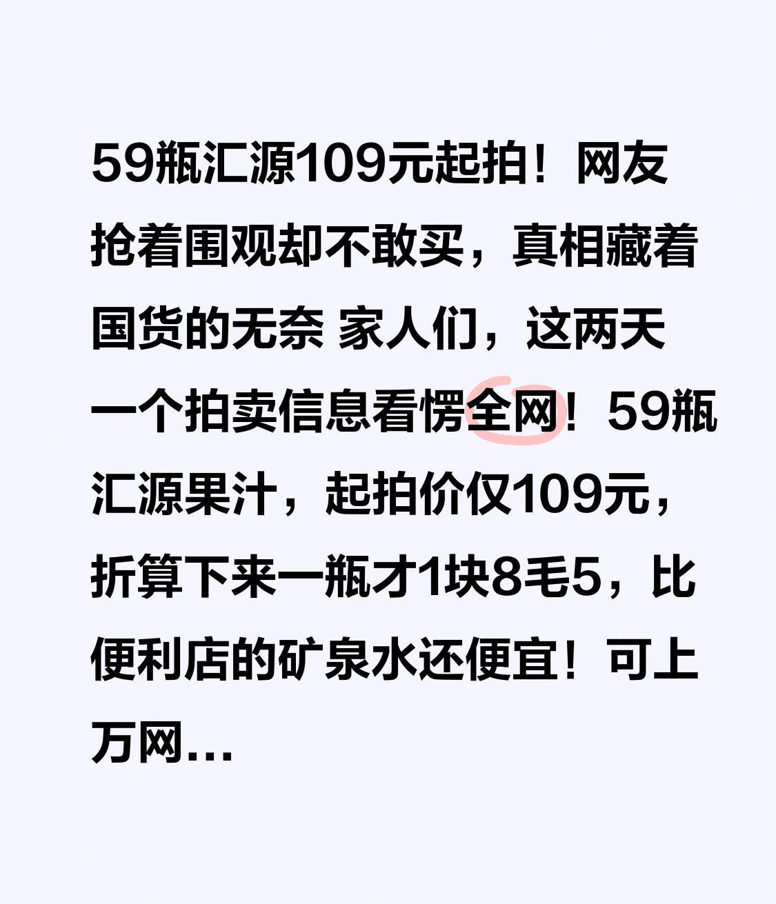 59瓶汇源109元起拍!网友抢着围观却不敢买,真相藏着国货的无奈 家人们,这两天一个拍卖信息看愣全网!59瓶汇源果汁,起拍价仅109元,折算下来一瓶才1块8毛5,比便利店的矿泉水还便宜!可上万网友蹲守围观,最终却没人敢轻易出价,这背后的原因,既现实又扎心。 提起汇源果汁,谁的童年记忆里没有它?逢年过节的餐桌上,红色的利乐包是标配;走亲访友的伴手礼,拎上两箱汇源,体面又实惠。曾经的它,是国货果汁的“顶流”,巅峰时期年营收超百亿,还拿下了奥运会赞助权,那句“有汇源才叫过年”的广告语,更是刻进了80、90后的DNA里。 这次上架拍卖的这批果汁,来自江苏宿迁一家汇源授权代工工厂,59瓶混合装里,橙汁、桃汁、沙棘汁一应俱全,生产日期是2025年3月,保质期12个月,目前还有近一个月才到期,单看品相,妥妥的“捡漏”好货。 可转折点来了,看清拍卖详情后,网友们瞬间冷静——不包邮,且运费自理!熟悉快递的都知道,59瓶玻璃瓶装果汁,加上包装重量,少说也有几十斤。从宿迁发到外地,普通快递运费就得百十块,偏远地区更是要两百多,算下来总价比直接买新货还贵。更关键的是,保质期仅剩一个月,物流路上耽搁几天,运到家可能就快过最佳饮用期了,谁也不想花冤枉钱买“鸡肋”。 更让人唏嘘的是,这批果汁的上架背景,是这家代工工厂刚刚被申请破产清算。很多人误以为是汇源集团不行了,其实这家工厂早在2017年就脱离了集团体系,只是保留了授权生产资格,如今的拍卖,不过是破产清算中的资产处置。但即便如此,看着曾经的“国民味道”被如此低价甩卖,还是让无数网友感慨万千。 有人在评论区留言:“不是嫌贵,是心疼!小时候觉得汇源是奢侈品,现在沦落到按斤拍卖,心里不是滋味。”也有人说:“就算运费贵,也想拍下来,就当为童年买单。” 其实,网友们纠结的从来不是运费,而是对国货品牌的惋惜。从辉煌到落寞,汇源的起伏,是很多传统国货的缩影:面对新消费品牌的冲击,面对资本运作的波折,曾经的巨头们举步维艰。 这109元的起拍价,拍的不是果汁,是一代人的青春回忆。我们期待的,从来不是低价捡漏,而是看到曾经的国民品牌,能重新站稳脚跟,再次走进千家万户。 愿每一份坚守品质的国货,都能被时光温柔以待;愿那个陪伴我们长大的汇源,能早日迎来属于它的“二次绽放”。你小时候,有没有一瓶汇源果汁的专属回忆?