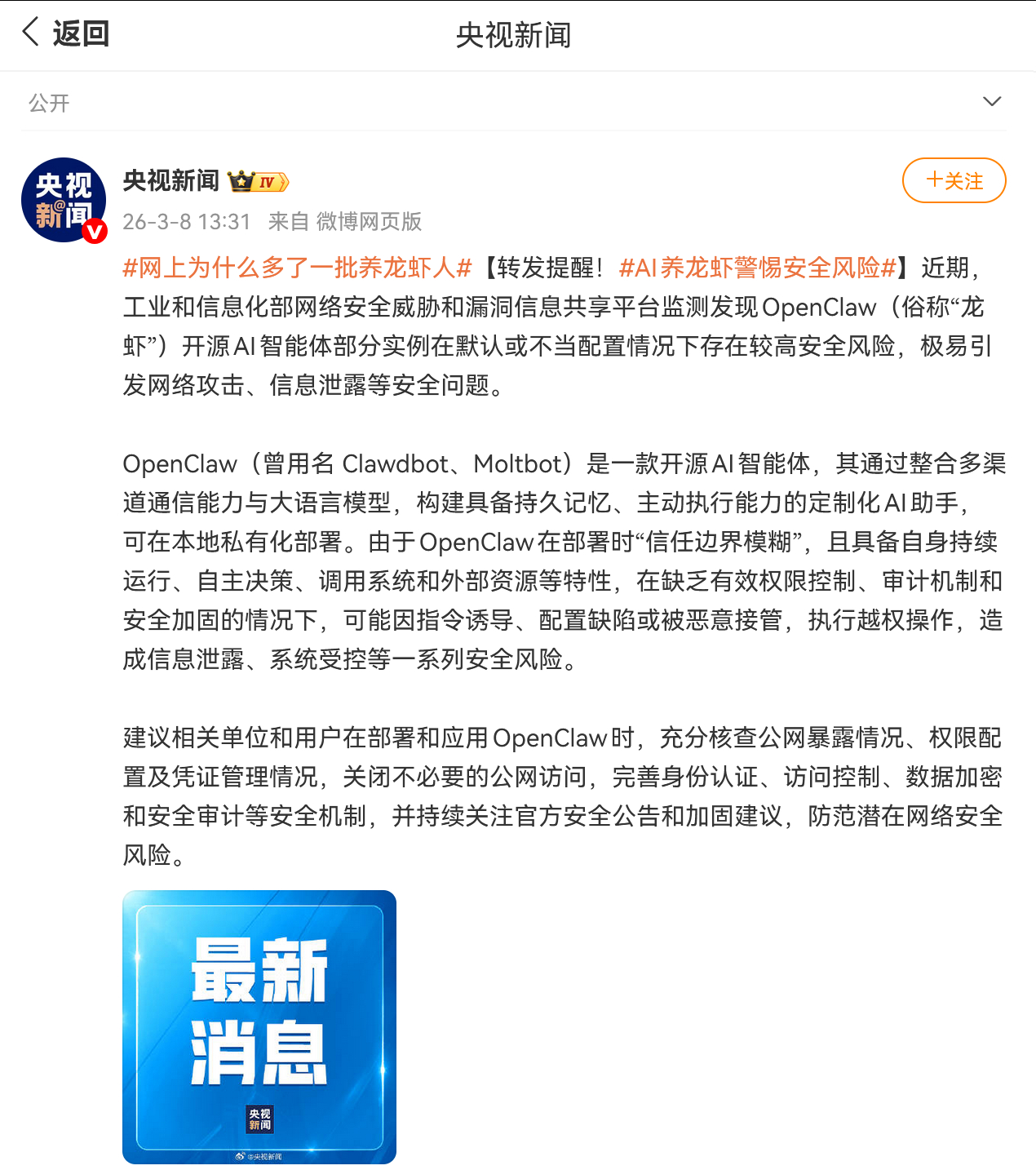 工信部提醒养虾风险:近期,工业和信息化部网络安全威胁和漏洞信息共享平台监测发现O