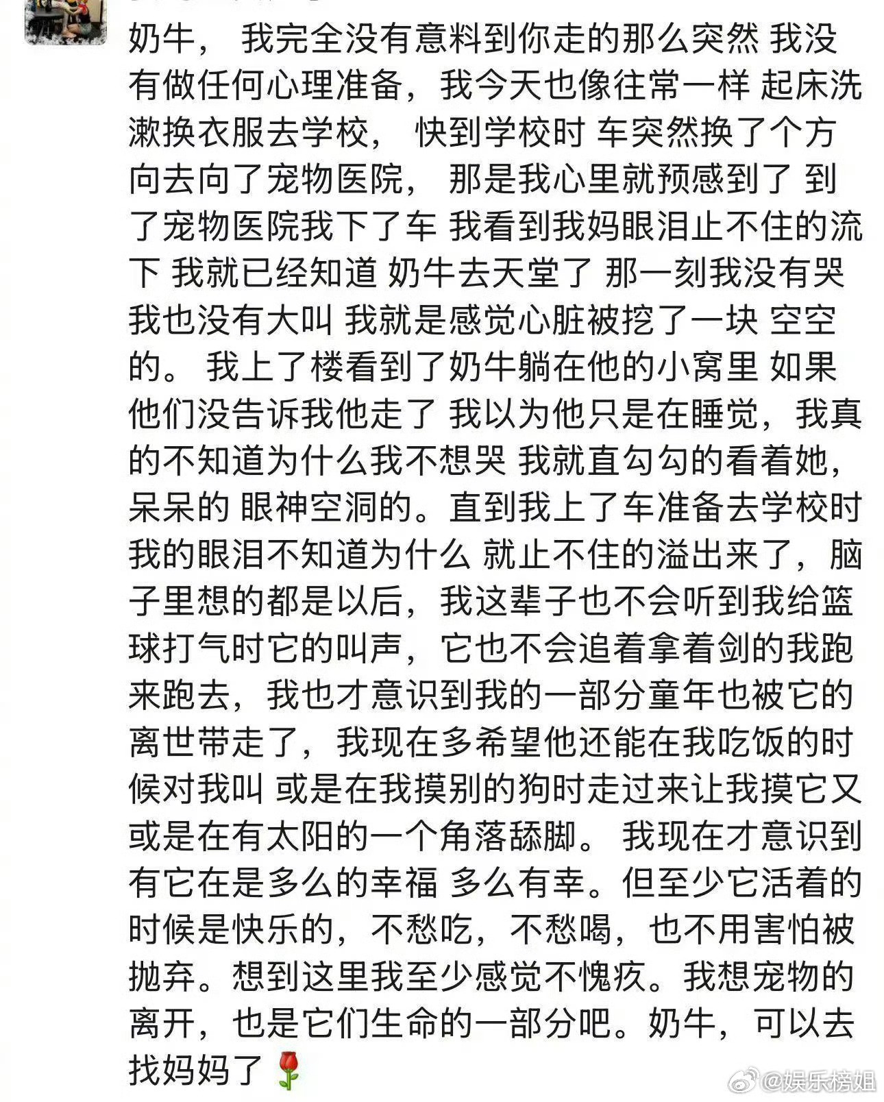 等等写的奶牛日记孙俪家养的小狗(奶牛)去世了,孙俪晒出等等为奶牛写的日记,等等见到奶牛躺在小窝里时没有哭,上车后眼泪止不住的溢出来了,奶牛的离开把那一部分的童年也带走了,等等文笔好好,奶牛这一世有你们很幸福,它只是去找妈妈了,抱抱等等