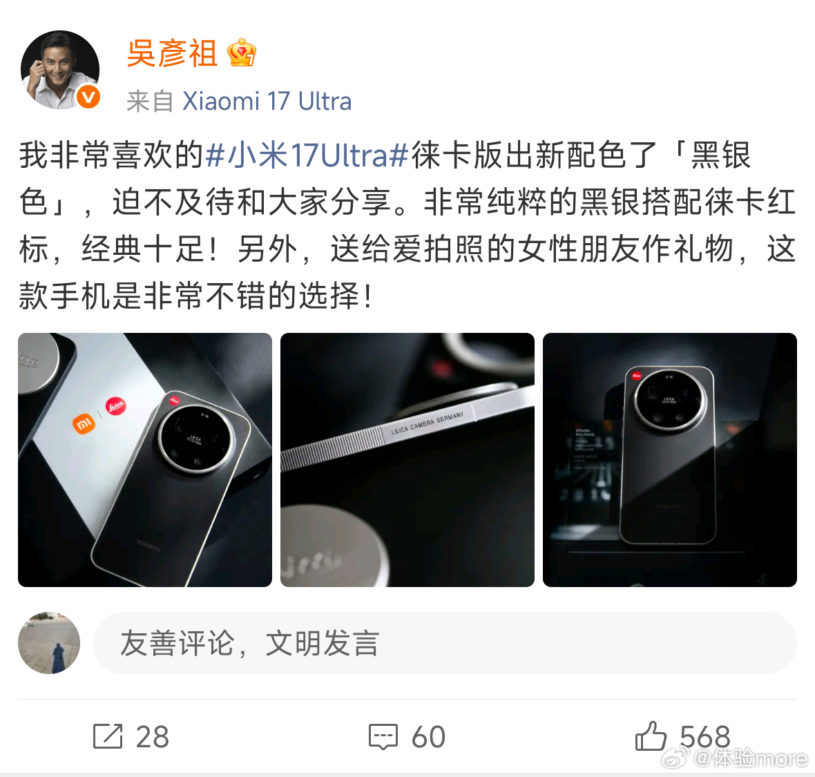 吴彦祖开箱小米17Ultra新配色这个黑银撞色是真好看啊,更有徕卡味。3月10号就要开售了,而且这个配色首销独享小米手环9 Pro和限定影像随行包,还限时赠价值998元尊享服务,既有随行好物又有用机保障。
