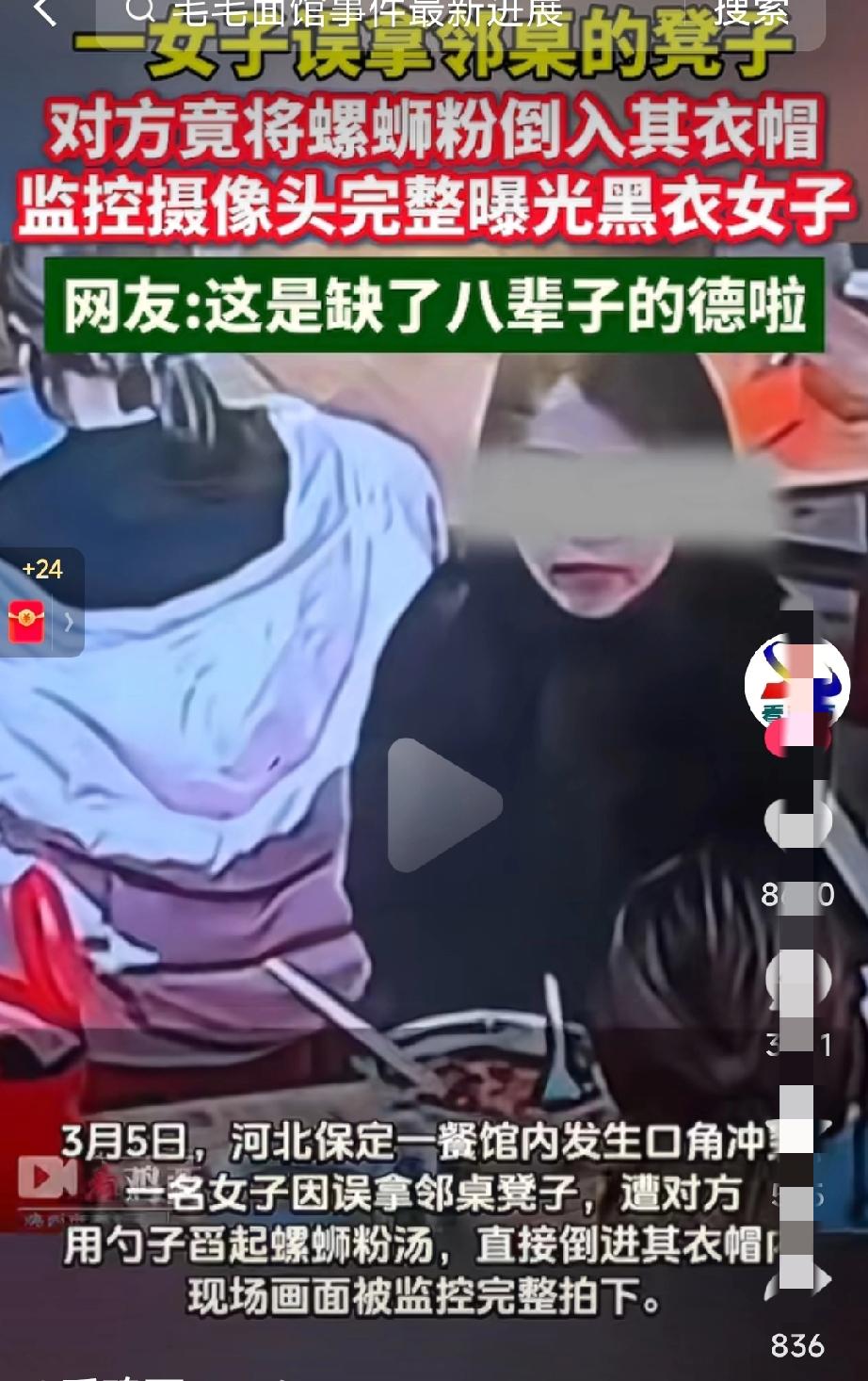 天生坏种!严惩到底!往别人帽子里泼螺蛳粉汤的女子麻烦大了! 近日在河北保定一螺蛳粉店里就餐的穿羽绒服女子因误拿邻桌黑衣女子的凳子,引发争吵! 然而黑衣女子竟然趁女子不注意,把螺蛳粉的热汤倒进穿羽绒服女子的帽子里! 这个动作被店内监控完整的拍摄下来!就因为拿错凳子,结果竟然做出这样卑劣的行为! 被泼汤的女子很气愤,已经报警。表示和黑衣女子硬刚到底,绝不妥协!现在黑衣女子的亲戚和工作单位都已经知道了女子的行为! 这样的行为不仅丢人现眼,工作也可能没了,这就是报应! 河北