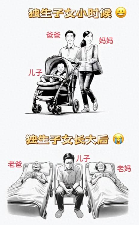一个非常不好的消息:中国超2亿独生子女面临的非常严峻问题 根据官方统计,中国独生子女的数量早已经超过了2亿,如果算上这几年新增的数据,实际规模可能更大。 有些事是突然就砸下来,让人连准备都来不及。就拿独生子女家庭来说,一通深夜电话或者医院的通知,瞬间就能把原本平稳的生活搅成一团乱麻。 在中国,独生子女已经超过两亿,很多人进入了中年,父母也步入衰老期,大家都知道这世上最怕的就是家里老人出大事,因为这一代人身后连个替班的都没有。 家里的老人一旦生病,所有难题都落在独生子女头上。每天,单位996,晚上赶回家还得照顾父母,孩子的学业和成长又一点都不能忽略。 昔日“小皇帝”“小公主”成了家庭的保底者,不管有什么麻烦,只有他们能扛。 如果以前有兄弟姐妹,分担任务是顺理成章,现在却只能一个人顶上所有压力。医院的走廊、缴费窗口、守夜的床头,都是他们必须面对的地方,没有人能帮他们分担片刻。 钱也成为最大的难题之一,城市里本来压力就大,尤其是双独家庭,工资一到,房贷车贷就先扣掉一大片,孩子学习的补习和兴趣班本来就昂贵,再加上老人慢性病要吃药、看病,开销越来越大,攒钱成了奢望。 如果有一天家里老人进了重症监护室,几天的花费就能让存款见底,原本所谓的“体面”,都经不起一次突发事件的考验。 很多人觉得有钱就可以解决养老问题,其实远远不是这么简单。全国失能和半失能老人接近五千万,专业护工只有两百多万,供需两头悬殊,护工价格飞涨。 有时候是钱够了却请不到人,春节或农忙的时候护工就都回家了,老人只能靠子女自己照看。哪怕花钱请人,老人还未必愿意,他们舍不得花钱,总觉得那是浪费。 除了生活压力,独生子女还得忍受心理上的煎熬。有不少人离家在外工作,父母在老家,日常交流只能靠电话或者视频。 父母总说自己没事,报喜不报忧,生怕孩子担心。可一旦电话打不通或接到急报,那种让人瞬间慌乱的感觉,只有经历过的人才懂。想请假回家照顾,单位的竞争又让人举步维艰。 35岁以上职场缺口大,刚请假就可能被别人取代,护理假的政策也很难落到实处,大家都怕职业被中断。 这几年,独生子女曾经被全家呵护,资源都往一个孩子身上倾斜。那时候觉得生活多滋润,现在到了中年才发现,曾经的独享其实是一种隐形负担,随着父母年老,所有责任都会如期而至,没有人分担。 这一代独生子女承受压力不仅是家事,更是社会大问题。中国老龄化趋势明显,老人越来越多,照护资源远远跟不上。这些人不得不硬扛,既没有兄弟姐妹帮忙,也没有可以替代的退路。 孩子年幼,父母年迈,自己却不得不成为唯一的保障。哪怕再苦再累,也只能咬牙撑着,因为一旦倒下,就没有任何人来支撑家庭。 面对现实,这两亿独生子女家庭,是整个社会老龄化的缩影。他们每天睁眼都要面对不可预测的挑战,是中国家庭结构变化之后最真实的“承重墙”。他们没有退路,也没有办法躲避,每一天只能硬着头皮往前走。