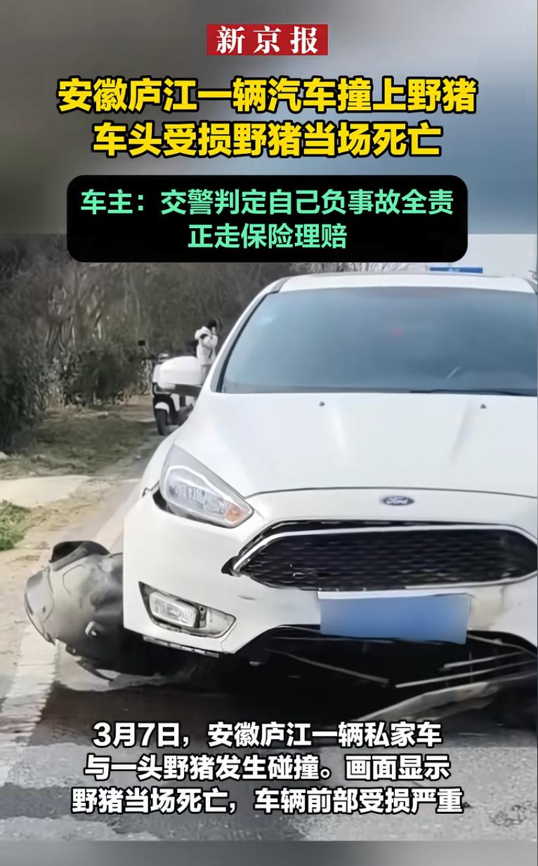自认倒霉吧!安徽庐江,一辆白色福特轿车在路上开得好好的,草丛中突然蹿出一头大肥野猪,车主躲闪不及直接撞了上去,结果野猪当场断了气,车头撞了个稀烂,交警赶到后竟然判定车主全责,网友:这野猪没主儿没钱,最后还得是车主扛下所有。 当天,这名车主正常行驶在路上,谁能想到路边林子里会突然飞出一坨黑影,伴随着一声闷响,几百斤重的成年野猪直接被撞飞出几米远,横在路中间不动弹了。 车子前保险杠当场脱落,引擎盖都给掀变了形,车主也被震得轻微受了伤,看着这一地的狼藉,他站在路边是一脸苦笑。 交警接警后火速赶到现场,核对完情况直接出具了事故认定书,判定车主全责。 之后,林业局的人也很快过来了,为了防止这来路不明的猪肉流入餐桌或者传播病毒,工作人员直接把野猪拖走去搞无害化处理了。 车主只能眼睁睁看着那几百斤肉被拉走,自己还得赶紧给保险公司打电话定损,毕竟这车修起来估计不是个小数目。 这事儿传到网上,评论区里也是吵得不可开交。 有懂行的网友直言,这判全责其实是交警在帮车主,因为只有自己担了全责,保险公司的车损险才能名正言顺地赔钱,要是判野猪有责,保险公司想找人代位求偿都找不着主儿。 也有网友不忿,觉得既然野生动物归国家管,那出了事凭啥不让林业局负责,权利和义务难道不对等吗。 很多网友都在问,遇到这种事能不能找林业局索赔。 说实话,除非你能证明当地林业部门管理上有重大过失,比如在野猪频繁出没的路段没设警示牌或者没搞好防护网,否则这种野生动物冲撞基本上都被视作不可抗力的交通意外。 法律上把野猪看作无主物,它没监护人也没钱包,在找不到第三方赔偿的情况下,判定驾驶员全责是为了触发保险理赔流程。 毕竟在交警眼里,驾驶员在经过可能有野生动物出没的区域时,负有更高的观察和避让义务。 这次撞的是猪,要是撞的是个没主的石头,最后不也得是车主自个儿走保险吗。 对此,你怎么看?