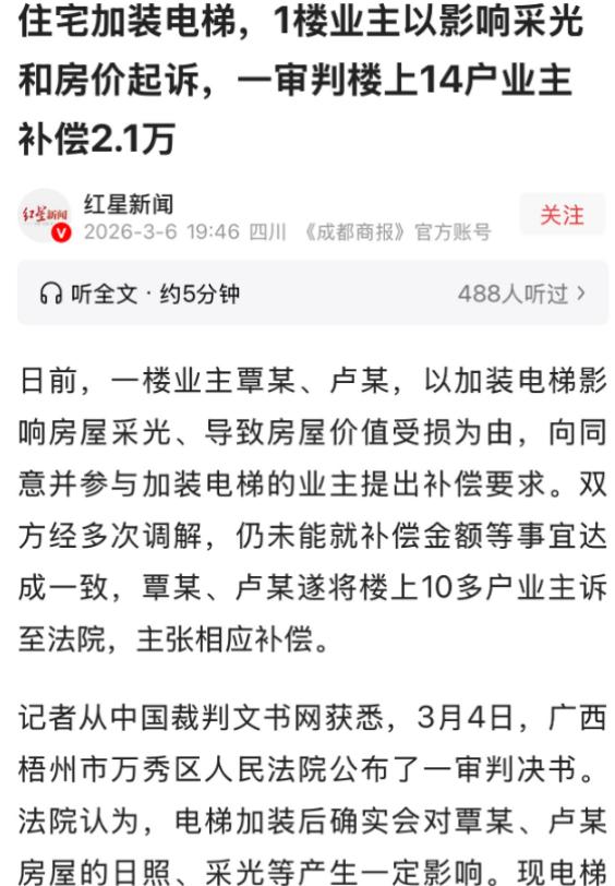 广西梧州,一对夫妻住一楼,楼上14户业主未经允许加装电梯,电梯建在夫妻家房屋东南侧,遮挡采光、影响通风,还致房屋贬值,夫妻俩多次协商,楼上业主起初给1万补偿,后经社区协调提到1.2万,但夫妻俩认为远不够弥补损失,沟通无果后,夫妻俩将14户业主告上法庭,法院审理查明电梯只在4楼及以上停靠,一楼用不上却要承担后果,高层业主应合理补偿,最终判决14户业主每户补1500元。 广西梧州住在一楼的覃某和卢某夫妻俩,本来在这栋9层步梯房里住得好好的,没招谁没惹谁,却被楼上14户邻居的一个决定,搅乱了平静的生活。 事情的起因很简单,楼上的邻居们觉得爬楼梯麻烦,尤其是高层的老人小孩,就商量着加装一部电梯,按理说,加装电梯是好事,但他们没充分考虑一楼夫妻俩的感受,也没真正达成一致,就擅自把电梯建在了夫妻俩房子的东南侧。 电梯一建起来,麻烦就来了,夫妻俩发现,自家的采光被挡得严严实实,以前大白天屋里不用开灯,现在有时候得靠着灯光才行,通风也大受影响,夏天屋里闷得慌,再也没有以前的通透感。 更让他们闹心的是,房子因为采光和通风变差,要是以后想卖掉,肯定会贬值,这可是实打实的损失。 夫妻俩也不想把邻里关系闹僵,就主动找楼上的14户业主协商,希望能得到合理的补偿,一开始,楼上的业主只愿意给1万块钱,夫妻俩觉得这点钱根本弥补不了采光通风和房屋贬值的损失,就没同意。 后来社区出面协调,楼上业主把补偿提到了1.2万,但夫妻俩还是觉得不够,毕竟这些影响是长期的,不是一时半会儿就能过去的,就这么来回协商了好几次,始终没谈拢。 而楼上的业主觉得自己装电梯是为了方便大家,给点补偿就不错了,但一楼夫妻俩觉得,自己没享受到电梯的任何好处,反而要承担所有损失,心里肯定不平衡。 沟通无果之后,夫妻俩实在没办法,只能拿起法律武器,把这14户业主一起告上了法庭,法院后来去现场勘查,查清楚了情况:这部电梯已经装完投入使用了,而且只在4楼及以上停靠,一楼根本用不上,却要承担所有负面影响。 法院认为,邻里之间相处,得讲公平,高层业主享受了电梯的便利,就应该给受影响的一楼业主合理补偿,最后判决下来,14户业主每户给覃某夫妻俩补偿1500元,14户加起来一共2.1万。 这个结果出来后,有人觉得合理,也有人替一楼夫妻俩抱不平,其实想想,这笔钱说多不多,说少不少,对楼上业主来说,相当于为电梯便利付了点代价,但对一楼夫妻俩来说,采光变差和房屋贬值的影响,远不是这2.1万能完全弥补的。 这件事也给大家提了个醒,老旧小区加装电梯,本来是便民的好事,但不能只考虑高层的便利,忽略低层业主的权益,要是一开始楼上业主就能多站在一楼的角度想想,好好协商,拿出双方都能接受的补偿方案,也不至于闹到对簿公堂。