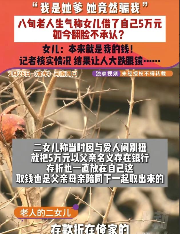金钱让人面目全非!河南周口,八旬老人称二闺女从他这借走了5万块钱,他身体不好,没钱吃药了,就去找闺女要钱,谁知她却翻脸不认账,还把自己赶了出来,老人气得直哆嗦,大骂闺女是骗子,连亲爹都坑,二闺女则委屈表示,这笔钱本来就是自己的,只是以父亲的名义存的而已,利息也都给老两口花了,双方各执一词,记者经过仔细核实,最后的结果让人大跌眼镜。   81岁的张大爷,身体一天不如一天,常年吃药得花钱,手里实在周转不开,就想起二闺女之前从他那借走的5万块钱,于是就拄着拐杖找上门,想把钱要回来应急。   谁能想到,往日里还算孝顺的二闺女,一听要钱,当场就变了脸,一口咬定自己没借过钱,还对着张大爷发脾气,最后干脆把老人赶了出门,张大爷站在门口,气得浑身直哆嗦,对着屋里大喊,骂二闺女是骗子,连亲爹都坑。   周围的邻居听见动静都围了过来,看着老人委屈的样子,纷纷替他打抱不平,觉得不管怎么样,都不能这么对年迈的父亲。   可这边张大爷气得直哭,那边二闺女也满肚子委屈,对着邻居不停辩解,说这笔钱根本不是借的,本来就是她自己的私房钱,二闺女说,几年前她和二女婿吵架闹得厉害,为了保住自己的钱,就偷偷把5万块钱存在了父亲名下。   她还说,这些年父亲年纪大了,没什么收入,这笔钱的利息,全都拿出来给老两口买药、买吃的了,根本不存在借了不还的说法。   二女婿也在一旁帮腔,说这些年张大爷生病住院、老家修房子,他们夫妻俩前前后后花了二十多万,从来没推脱过,怎么可能借老人的钱不还,反倒是老人年纪大了,可能记混了事情。   两边各说各的理,吵得不可开交,谁也说服不了谁,无奈之下,张大爷只能找记者来帮忙,希望能查明真相,要回自己的养老钱,记者来了之后,没有偏听任何一方,而是一点点核实情况,先找到了当年的存单,又去银行调取了流水。   这不查不知道,一查真相就浮出水面了。银行流水清清楚楚显示,这笔5万块钱是一次性存入张大爷名下的,根本不是张大爷说的,常年打零工一点点攒下来的。   张大爷一开始还坚持,说这笔钱是外甥一次性结给他的工钱,记者当场拨通了他外甥的电话,对方明确说,从来没有一次性给过5万块,平时结工钱都是几千几千地给,最多一次也没超过一万。   听到这话,张大爷瞬间就沉默了,脸上满是茫然和委屈,再也说不出反驳的话。说白了,这就是一场误会,张大爷年纪大了记性不好,把二闺女存在他名下的钱,记成了自己的积蓄,还以为是闺女借走了不还。   后来在记者和村委会的调解下,二闺女也主动向父亲道歉,说自己当初没跟父亲说清楚钱的来历,还对父亲发脾气,让老人受了委屈,她表示以后会好好孝顺父母,多关心老人的身体和心情。   张大爷看着道歉的女儿,也慢慢放下了心结,叹了口气,没再提要钱的事。钱能算得明明白白,可亲情一旦有了隔阂,就很难回到从前,一家人过日子,多些耐心,多些沟通,别因为一点误会,寒了最亲的人的心。