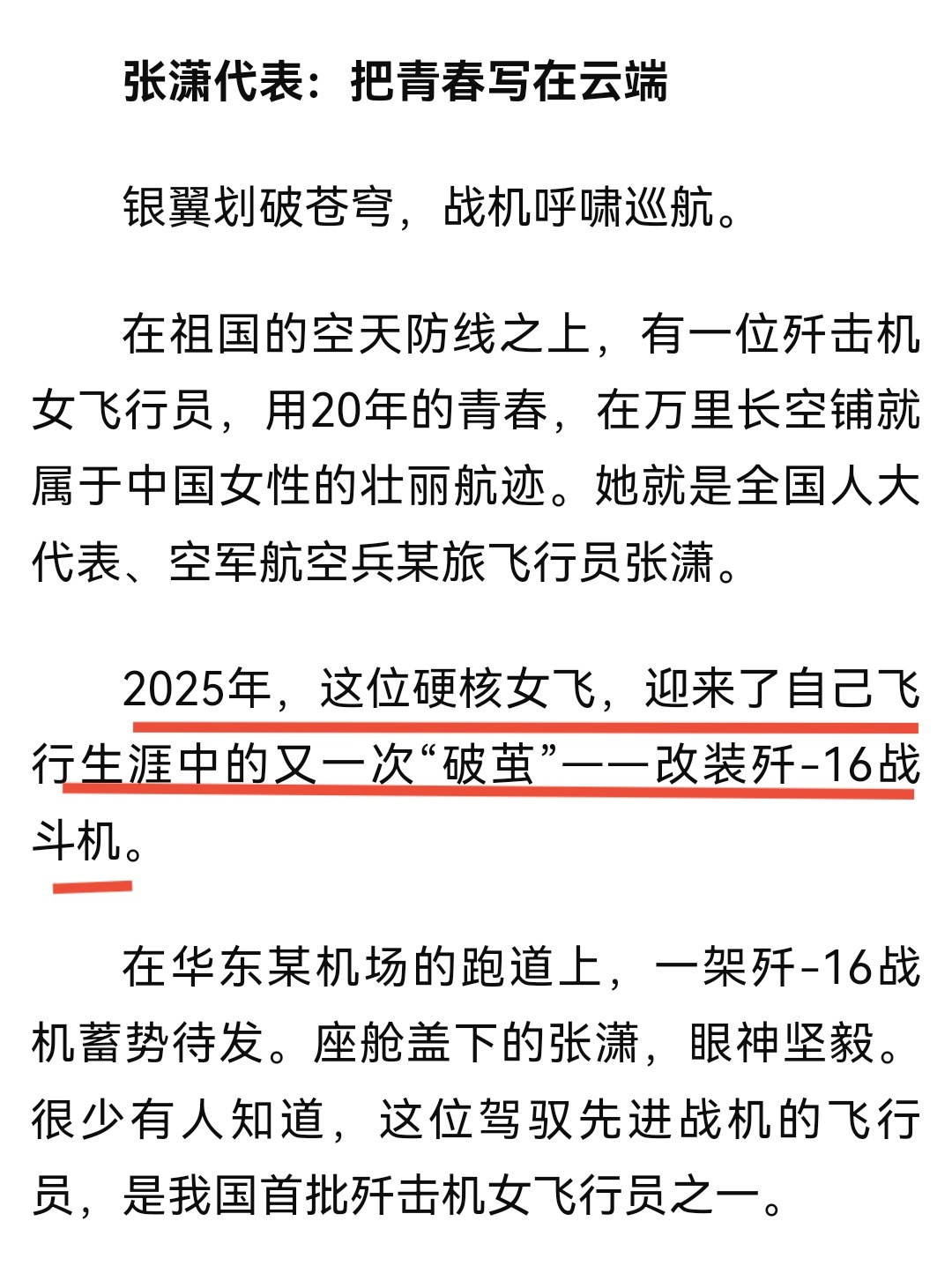 全国两会2025年,这位硬核女飞、全国人大代表张潇迎来了自己飞行生涯中的又一次“破茧”——改装歼-16战斗机。