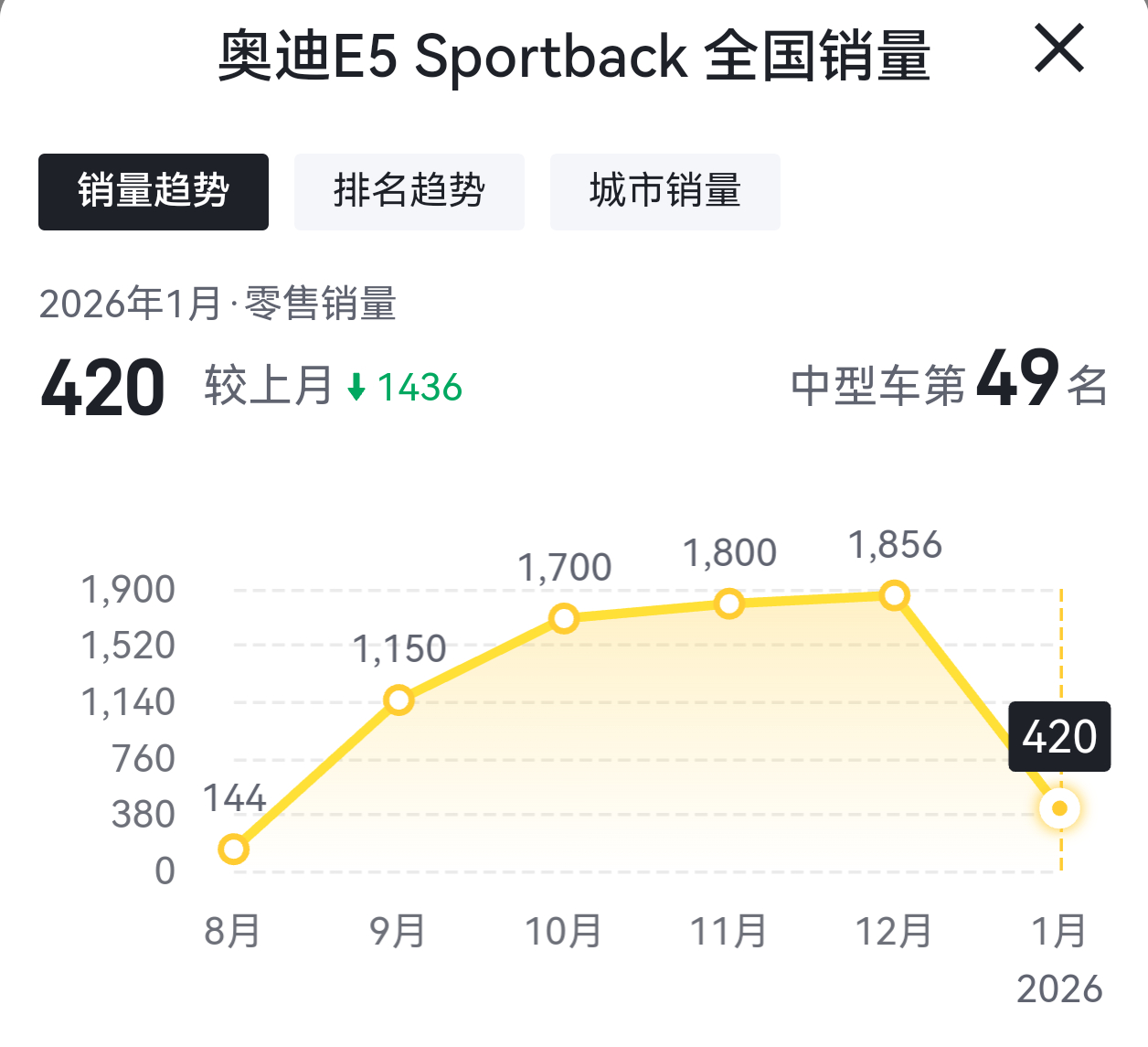 奥迪E5 Sportback价格不贵,20万出头,内外造型顶级,操控也在线,智能化也不差,奥迪品牌力也不错,方方面面都很好。但销量很一般,1月份只剩420辆。所以,今年要上市20多万旅行/猎装车的品牌,真有信心卖好吗?
