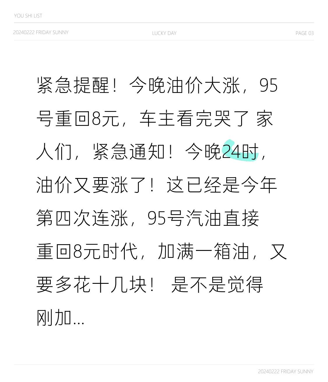 紧急提醒!今晚油价大涨,95号重回8元,车主看完哭了 家人们,紧急通知!今晚24时,油价又要涨了!这已经是今年第四次连涨,95号汽油直接重回8元时代,加满一箱油,又要多花十几块! 是不是觉得刚加完油没几天,钱包又要被掏空?不管你是开私家车的,还是跑运输、跑网约车的,这条视频一定要看完,关系到每个人的钱袋子! 先给大家算笔明白账:今晚24时,汽油每吨上调290元,柴油每吨上调280元。折算下来,92号每升涨0.22元,95号每升涨0.24元。50升的油箱,加满一箱就要多花11-12块钱,一年下来,光油钱就要多花大几百! 很多人都在问,好好的油价,为什么说涨就涨,还连着涨?其实根本不是咱们想的“人为调价”,背后原因很现实。 核心就是中东局势乱了!全球30%的石油都要经过霍尔木兹海峡,最近冲突升级,油轮不敢走,运输受阻,原油供应直接紧张。再加上产油国减产,国际油价一路飙升,咱们国内油价跟国际接轨,自然跟着涨。 本来以为年初油价能稳一稳,没想到一路飙升,从年初到现在,92号汽油累计涨了快6毛,95号更是逼近8.5元,不少车主直呼“加不起油了”! 转折点来了:油价涨了,生活成本也跟着涨!运费涨了,菜价、物价都会跟着动,最后还是咱们普通人买单。以前一脚油门不心疼,现在开车都要算计着里程,能不开车就不开车,能骑电动车就不烧油。 更扎心的是,短期内油价还降不下来。国际局势没缓和,供应缺口没补上,接下来油价大概率还会维持高位。对于咱们普通车主来说,只能默默接受,省着点开。 其实大家吐槽的不是油价本身,而是赚钱的速度,赶不上花钱的速度。每天辛辛苦苦上班,加油、吃饭、养家,每一笔开销都在涨,唯独工资不涨。 油价可以涨,但生活还要继续。在这里也提醒大家,今晚24时前,能加满油就加满,能省一点是一点。 也希望国际局势早日稳定,油价能早日回落,让咱们普通人开车不再心疼,生活少点压力。 你那边油价多少了?加满一箱油要花多少钱?评论区聊聊!