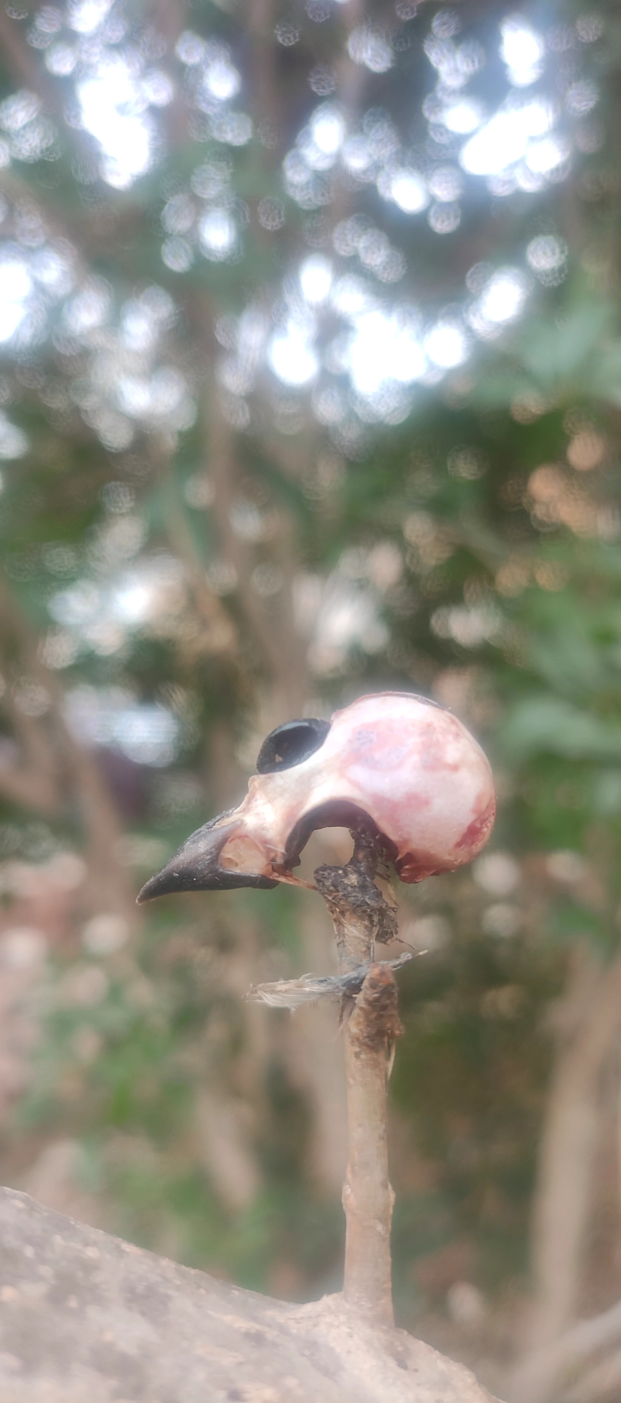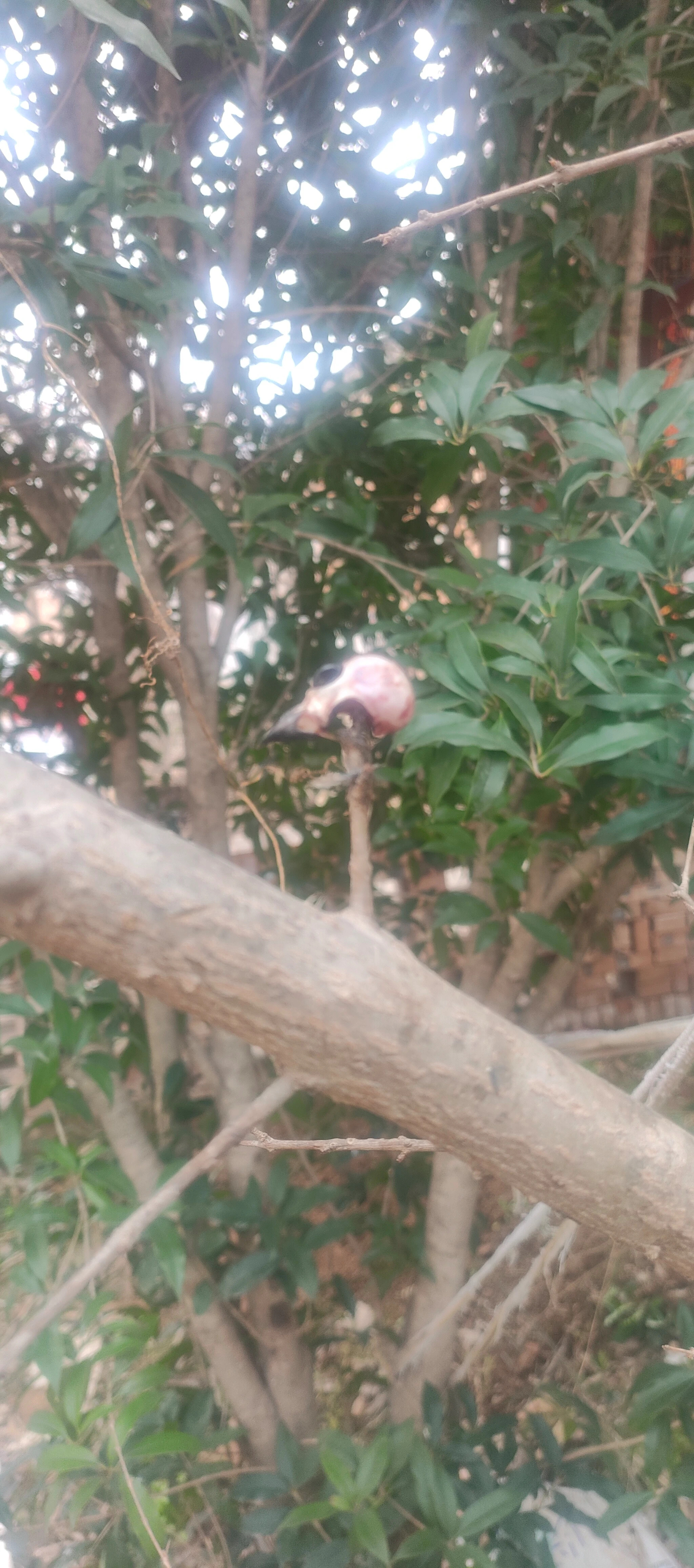 这是什么鸟干的 吃完还把鸟头挂树上