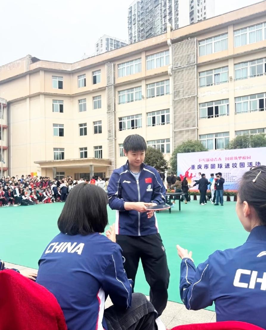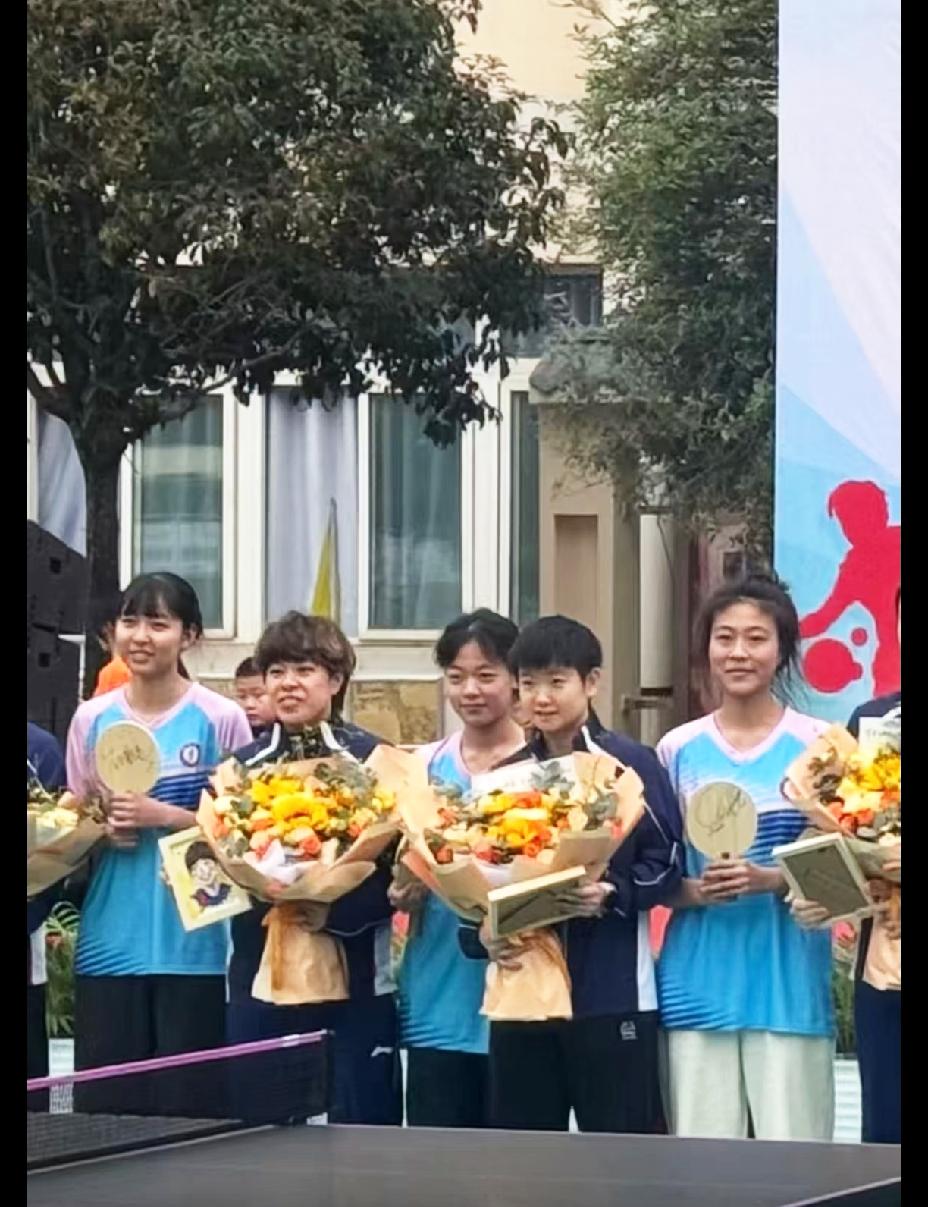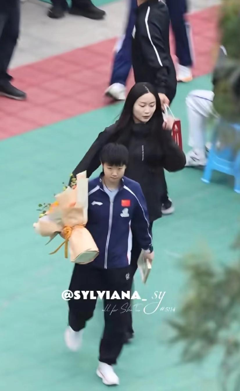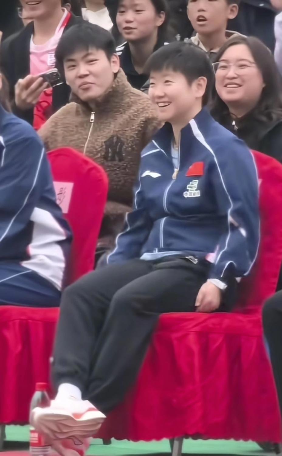 三八妇女节这天的莎莎, 格外的可爱, 乖萌萌实至名归。 原来上午男队参加活动, 下午女队参加活动。 女队来到重庆鱼洞中学, 这个女同胞的节日礼物太好了, 学校真是会安排。 莎莎小小的一个, 那一大束鲜花差点完全挡住她的脸, 今天的莎莎格外的美, 这才是最真实的莎莎。 莎莎和小朋友们一起坐着看活动的时候, 笑得那叫一个开心, 毫无违和感。 脚都够不着地, 还晃来晃去, 真是妥妥地小朋友一枚, 可爱极了。 (图片源自于水印)