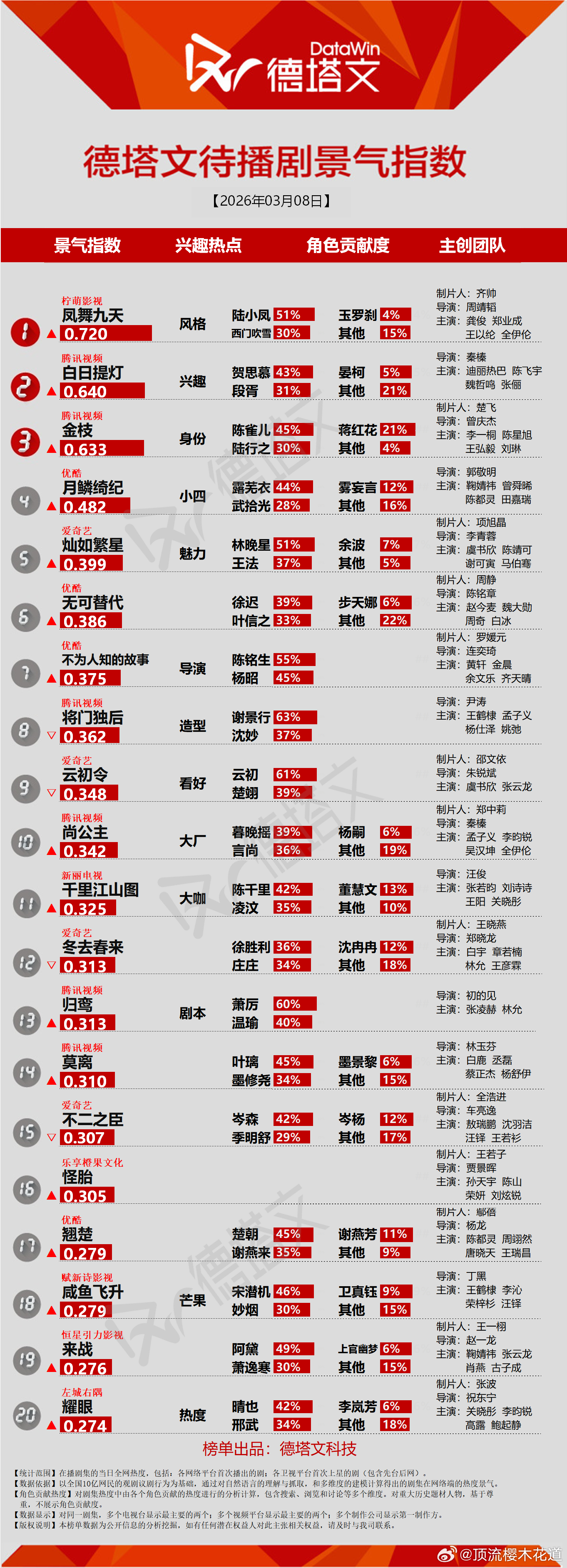 今日份德塔文景气指数逐玉2.417,新高男女主数据占比开始拉开差距了。待播剧凤舞九天景气指数登顶龚俊数据占比过半。