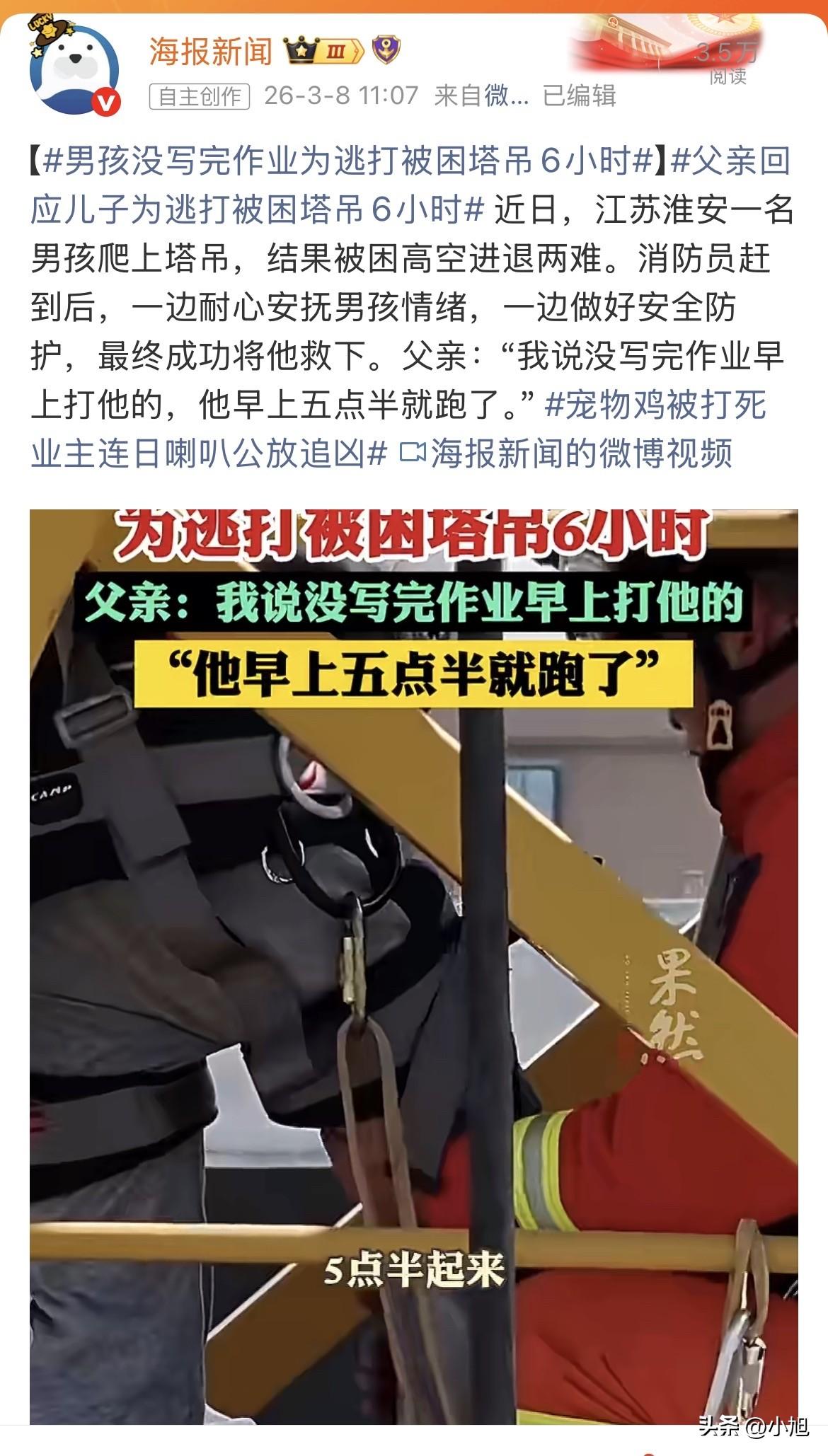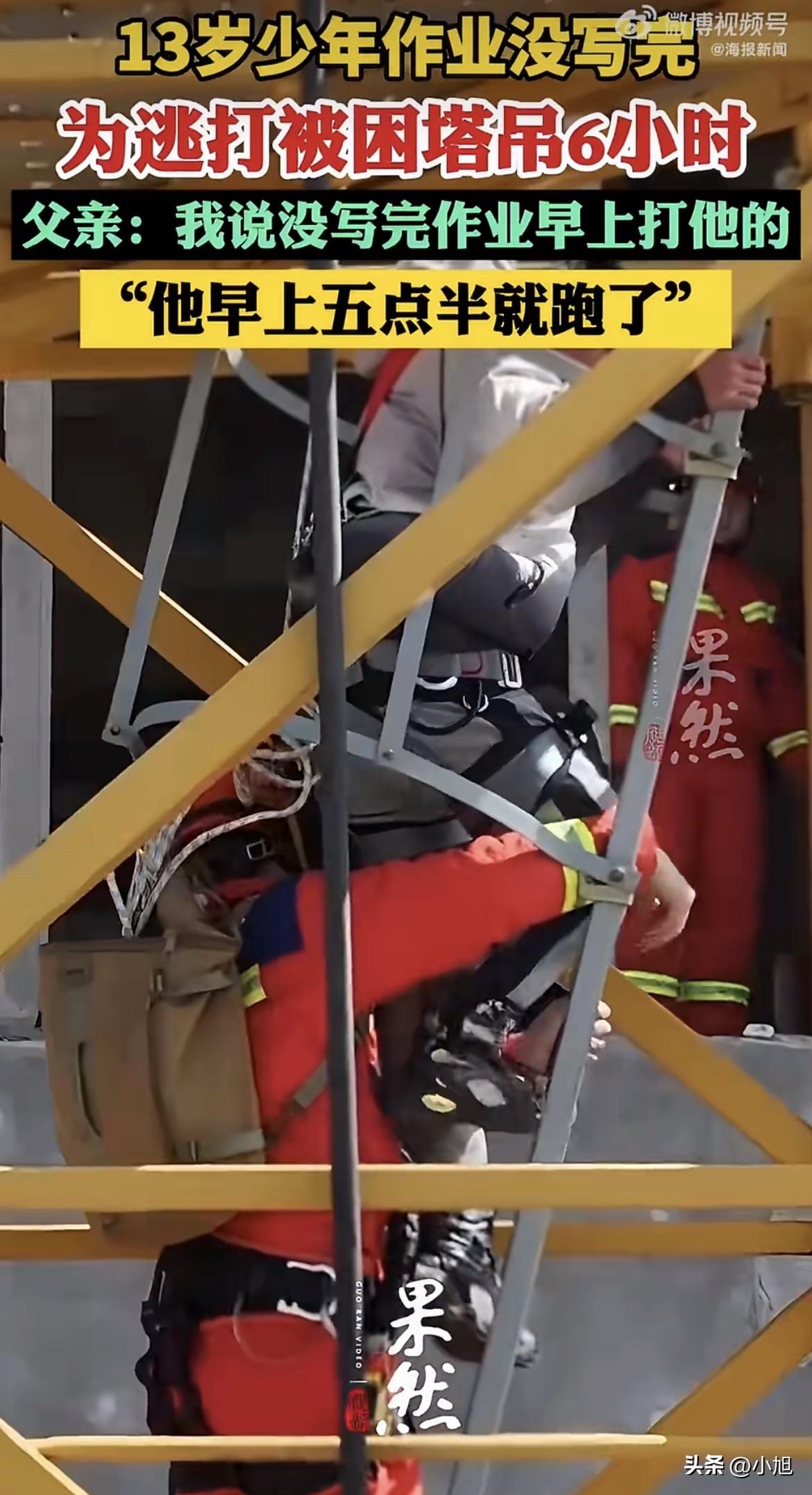 说真的,看到这个新闻我一直在想一个问题: 一个13岁的孩子,凌晨五点半爬起来往外跑,不去网吧,不去同学家,为什么偏偏爬上了塔吊? 很多网友说这孩子太虎,爬上去不想想怎么下来吗。 可我觉得,恰恰相反,这孩子想得太清楚了。 他知道父亲早上要打他。他算过,如果躲在家里,会被堵在屋里打。躲外面,天亮之后肯定会被找到,照样跑不掉。 他需要找一个地方,让父亲打不着他。 什么地方最安全?高处。工地塔吊,几十米高,父亲爬不上去。 这孩子凌晨五点半往塔吊上爬的时候,脑子里想的根本不是下来怎么办,而是——这个地方,爸上不来。 他把塔吊当成了一个安全的避风港。 你能想象他蜷缩在几十米高的铁架子上,往下看的时候腿都在发抖,可就是不敢下来。 因为在他心里,下面那个要打他的父亲,比这几十米的高空还可怕。 再说一个细节。 六小时。这孩子在上面待了整整六小时。 早上五点半到中午十一点半,正是太阳越来越晒的时候。铁架子被晒得发烫,他蜷在上面,没吃没喝,不敢动。 这六小时他在想什么? 可能想过无数次:下去吧,认个错,挨顿打就过去了。 可他没下去。一次都没有。 为什么?因为他心里清楚,下去之后要面对什么。 那种恐惧,比六小时暴晒、比几十米高空、比腿软发抖,都更难熬。 这孩子不是不懂危险,他是两害相权取其轻——高空和挨打之间,他选了高空。 还有一点很多人忽略了。 这孩子凌晨五点半出门,说明他一夜没怎么睡。 他可能头天晚上就知道作业没写完,躺在床上翻来覆去,脑子里全是天亮之后父亲那张脸,那句“早上打他”。 他睡不着,等着。等家里人睡熟,等天蒙蒙亮,然后悄悄爬起来,跑出去。 这种心理煎熬,比挨一顿打还难受。 说白了,这孩子不是在躲作业,是在躲一种让他透不过气的恐惧。 塔吊上六小时,是他用身体换来的喘息。 最后消防员把他救下来的时候,这孩子已经虚脱了。 可父亲说了一句什么? “我说没写完作业早上打他的。” 话里话外,还在强调那个“打”字。 可能这位父亲到现在都没想明白,孩子为什么要爬上去。 他只觉得孩子不懂事,闯祸了,让全家跟着丢人。 可这孩子需要的不只是一顿不打,而是一个不用爬塔吊也能待得下去的家。 你觉得,这孩子被救下来之后,还敢回家吗?