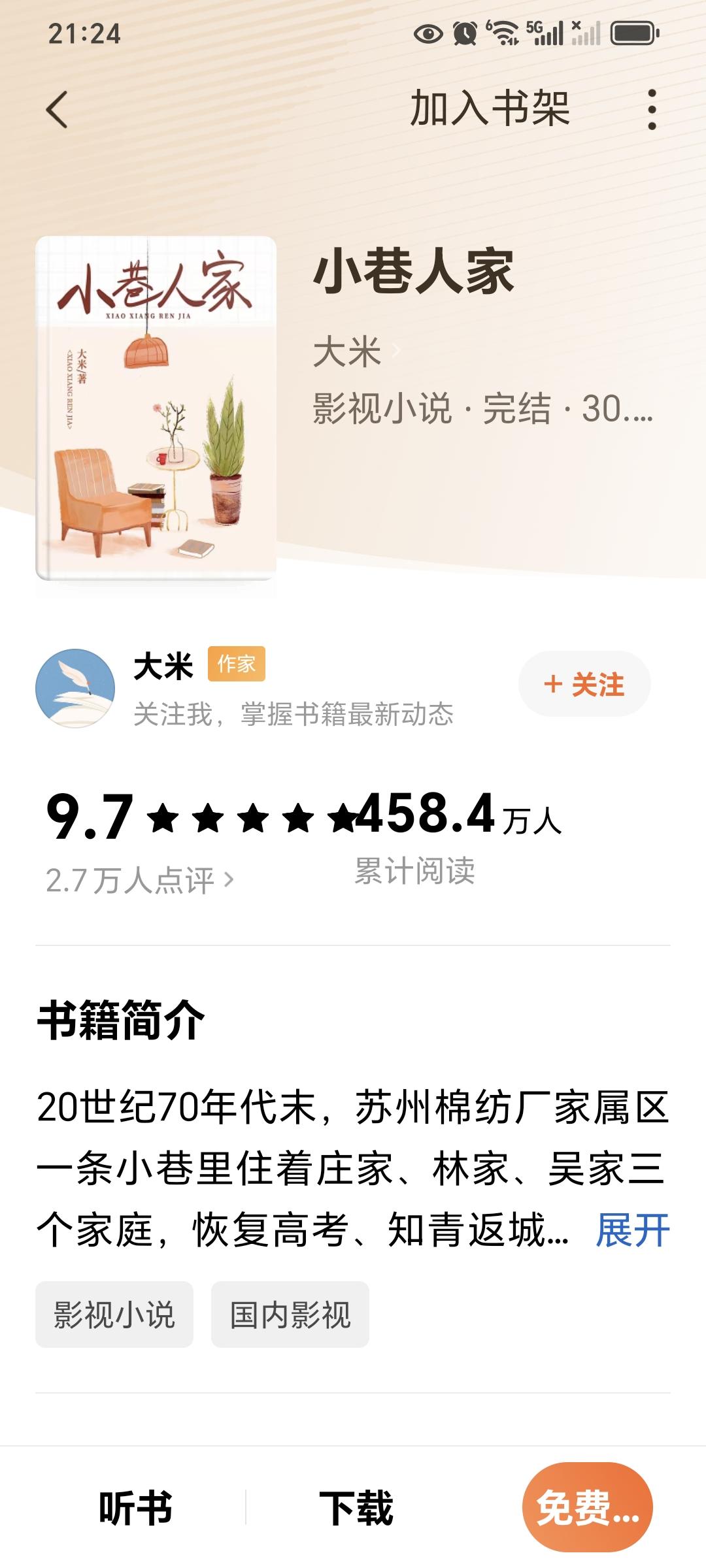 电视剧《小巷人家》,改编自作家大米的同名小说,由蒋欣、闫妮、王安宇、关晓彤、范丞丞等诸多明星主演。在这本小说爆火之前,大米在番茄上写了五十多本小说,多数都处于扑街状态,只有一两本有评分。 量变达到一定程度就会发生质变,前面虽然大米一直默默无闻,但不懈的坚持,换来了后面的一飞冲天。这本小说不仅出版了实体书,还被改编成电视剧,演员阵容更是豪华。一本书的成功,就可以让作家成为人生赢家。 这本三十万字的小说,大米自己说写了六个月,平均算下来,一天写不到两千字,这个码字量实在太低,被那些日更万字作者严重秒I杀。不过慢工出细活,久久方为功。一部作品是否成功,不在字数,而在质量,内容为王。 用心写作,不随波逐流,才能成就佳作经典。 共勉。 小巷人家 写作