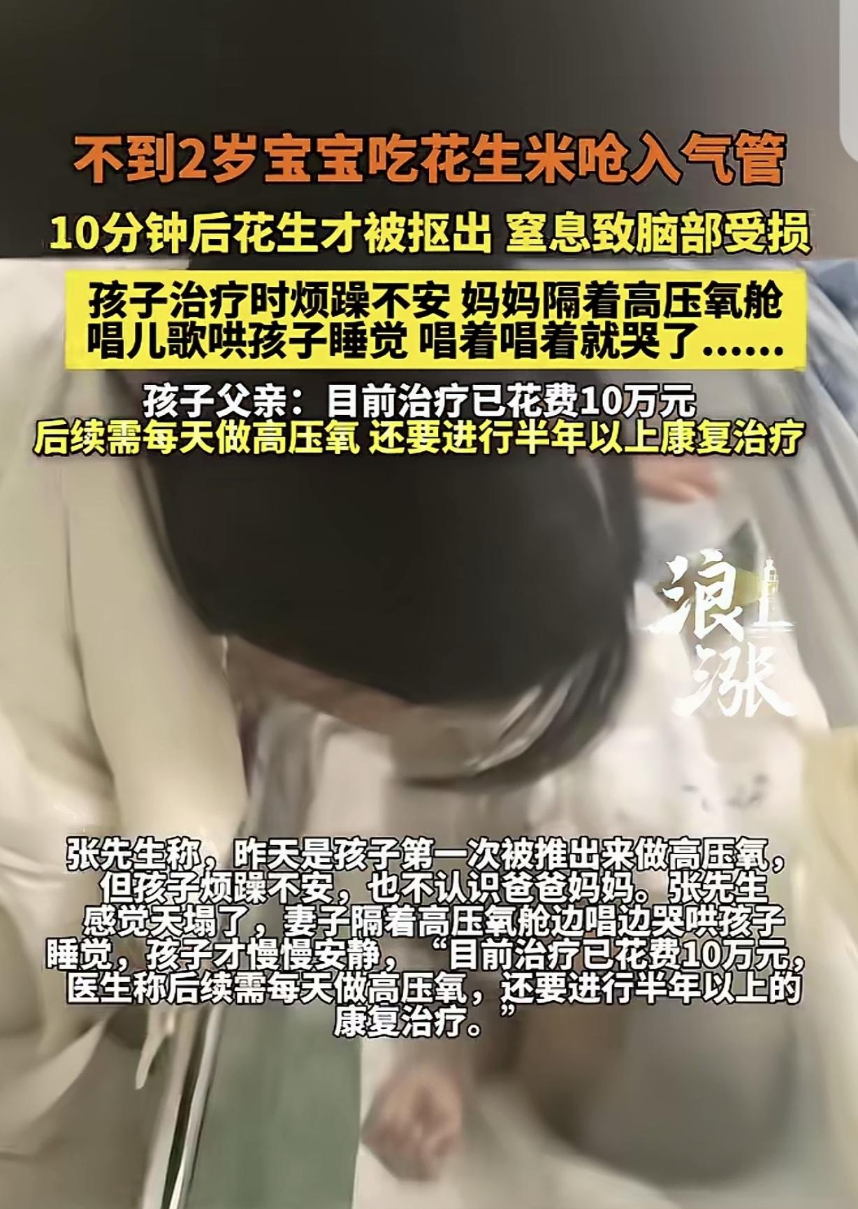 一1岁9个月男童,大年初七吃花生米时,一个不小心呛进气管,家长10分钟才把花生米抠出来,但因窒息太久,男童大脑受到损伤,在lCU治疗10天,还是不认识父母,男童在高压氧仓治疗哭闹不止,妈妈隔着高压氧仓给孩子唱歌哄他睡觉,唱着唱着就哭了! 大年初七那天,医院走廊的玻璃舱外,一个年轻女人把脸死贴在冰冷的透明板上。 舱里面,她1岁9个月的儿子正拼命拍打舱壁,张大嘴巴无声地嘶吼。高压氧舱把母子俩活生生隔成了两个世界。 女人哆嗦着嘴唇,断断续哼那首平时哄睡的儿歌。唱到一半,声音全卡在喉咙里出不来了。 这已经是这家人的日常了。他们怎么都想不通,春节饭桌上的一颗下酒零食,怎么就把好的日子砸了个稀巴烂。 那颗花生米滑进孩子喉咙,前后连两秒钟都不到。男孩当时双手疯狂抓脖子,小脸涨得紫红发黑,嘴巴张到最大却发不出半点声音。 如果当时有人懂点急救常识,哪怕只是准确发力拍几下后背,那颗要命的坚果都有机会弹出来。 两口子凭着本能反应,直接把手指硬生生捅进孩子嘴里,想把异物生抠出来。 这是最致命的操作。湿滑圆润的花生米根本夹不住,反而被手指一下一下往气管深处推。 脸色发紫,眼神涣散,软塌塌地瘫在大人臂弯里,像个破布娃娃。 大脑一旦缺氧逾四分钟,便会引发不可逆的器质性损伤。这一短暂的时间阈值,警示着我们大脑对氧气供应的高度依赖与脆弱性。 重症监护室的电子大门闭合了整十天。当这扇门再次推开,摆在张先生夫妇面前的是两份冰冷的判决书。 第一份是账单十万块钱瞬间砸进去,这个普通家庭的积蓄被掏了个底朝天。 第二份是医学现实。孩子命是保住了,但大脑皮层被缺氧彻底洗劫一空。那双眼睛看着日夜守在床边的爸妈,就像在看路边的两块石头——完全陌生。 他不认得人了,认知功能全盘丧失。医生直接交了底:想唤醒大脑?每天高压氧治疗起步,康复期至少拉长到半年以上,还不一定能恢复。 可每进一次氧舱,孩子就受一次罪,这种精神折磨谁扛得住? 惨剧曝光以后,网上有人冷冷甩出一句:孩子最大的危险,其实就是无知的父母。 花生、瓜子、豌豆,在不到两岁孩子的口腔里,就是一枚枚上了膛的子弹,随时能要命。 幼童的气管有多细?连一根吸管粗都没有。一颗遇水膨胀的坚果,或者一块海姆立克法根本不管用的胶状果冻,足以在瞬间扼断生机。 这绝不是孤例。有人见过四个月大的婴儿,长辈随手拿生花生逗弄嘴唇,孩子猛一吸气,坚果瞬间溜进深处,差点没抢救过来。 还有人在外头碰见过,长辈非要把开心果塞给七八个月的婴孩,呛咳了还在往里喂。要不是路人硬把碗夺下来,又是一出人间惨剧。 甚至连平时看着安稳的秋千,都能在大人一个转眼之间,把勒住脖颈的孩子送进抢救室。我们总觉得厄运绝不会敲自家的门。 可你连基础的保命动作都没攥在手里,哪来的底气去赌运气? 对一岁以下的婴儿,拍背和胸部冲击要交替循环做。一岁以上的,站背后环抱冲击腹部。同时喊人打120,这就是硬规矩,没得商量。 可现实里真出了事,多数家长就只会把手往喉咙里猛掏。这就好比水管漏水了,你拿个铁锥子使劲往下捅,全凭一股绝望的蛮力,越捅越糟。 高压氧舱的电机还在嗡嗡作响。舱外崩溃的母亲,和舱内眼底空洞的男孩,把侥幸心理撕得渣都不剩。 你今天没当回事的安全防线,明天可能就是横在病房门外的那堵玻璃墙。到那时候,砸再多钱,流再多血,都敲不开它。 信息来源:浪涨新闻