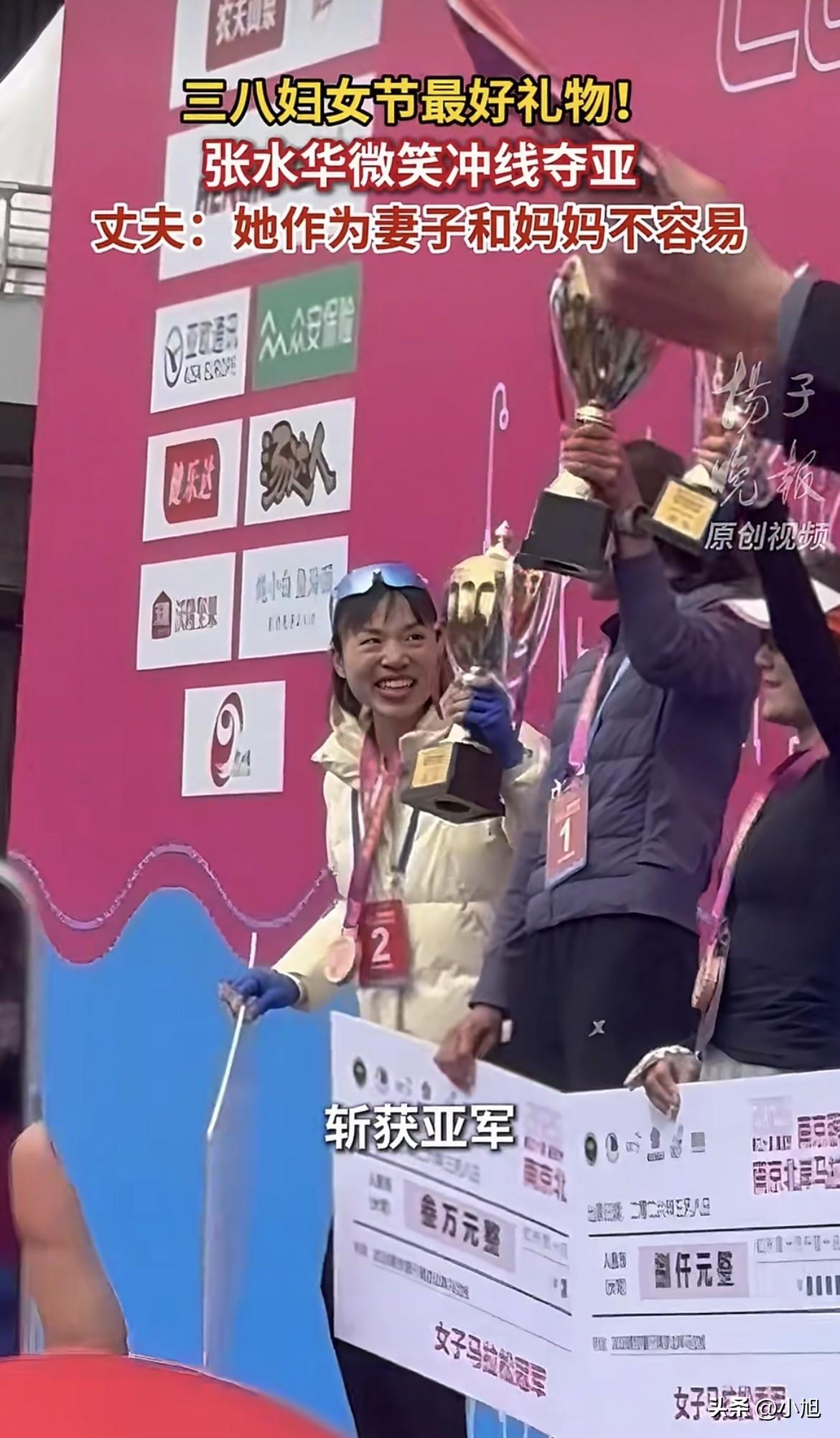 说真的,谁也没想到,今天这个亚军,比冠军更有看头。 3月8号早上7点半,南京长江边。张水华冲过终点线,2小时36分23秒。女子全程马拉松,第二名。她笑得很灿烂,对着镜头挥手。可看台上,她丈夫王岢站在那儿,眼睛红了。 记者问他,今天妇女节,想对老婆说点啥?这个男人憋了半天,憋出一句大实话:“作为妻子和孩子的母亲,张水华一路走来真的不容易。祝她节日快乐。” 一句“不容易”,把时间拉回到去年8月。 那时候,张水华还是福州一家大医院的护士,也是跑圈里出了名的“最快女护士”。哈尔滨马拉松,她拿了国内女子冠军,跑出2小时35分27秒的好成绩。冲线后,记者问她怎么平衡工作和跑步,她突然就哭了,说希望领导能支持她调休跑马拉松。就这20秒的视频,炸了锅 。 有人说她道德绑架同事,占用别人的休息时间去跑马赚钱。有人翻出她以前的回复“天天休息,我都快抑郁了”,说她拿着编制还卖惨。评论区没法看,私信99+全是骂她的。合作了几年的运动品牌361°,连夜解约 。 王岢那时候没辙,半夜趴在手机上一个一个回评论,回了一两百条,解释排班表,解释妻子不是那样的人。没用,骂声更多了。那段时间,他整晚整晚睡不着觉,压力大的时候,偶尔会借酒消愁 。 今年1月2号,张水华发视频:辞职了。那天她刚拿了2026年第一个冠军,奖金1万5。有人算过,她辞职前三个月,比赛奖金加起来超过20万 。 可全职跑者这碗饭,真的好吃吗?圈内人都知道,赛事奖金要交20%的税,来回差旅自己掏,拿不到冠军就是赔本赚吆喝。品牌代言?出了那档子事,谁敢轻易签 ? 张水华自己倒看得开。辞职后接受采访,她说就想当个普通人。离职那天,她没跟同事打招呼,是“不辞而别”。有同事休完产假回来问她:“我怎么休个产假就再也看不到你了?”她忍住了没哭 。 2月份,好消息来了。先是一个成立才一年多的运动眼镜品牌锐跑签了她,官宣词写的是:“欣赏她在长跑中展现的专注与坚韧。” 没过几天,特步也签了她,成为品牌签约运动员 。这下,她终于有正经代言了。 今天南京这场比赛,是她在马年的第一场全马 。对手黄菲太强了,1986年出生,今年39岁,江湖人称“湖南业余一姐”。赛前专门去高原集训,体能拉得满满的。从发枪开始就一路领跑,最后2小时30分26秒夺冠,还破了赛会纪录 。 张水华没跟上,跑了2小时36分23秒,第二。但比去年在这儿跑的成绩提高了,名次也从第三变成了第二 。赛后她在社交平台上写:“38节,不晒鲜花不晒礼物,晒晒42.195公里完赛的喜悦。在这个属于我们女性的日子里,用速度和奖牌定义自己的光芒。” 领奖台上,她笑得很用力,像要把这大半年的委屈都笑掉。 王岢一直站在赛道边,看着妻子从远处跑来,又看着她站上领奖台。记者问他有什么祝福,他说不出漂亮话,就想说一句:她真的不容易 。 今天妇女节,多少人在晒花晒礼物晒大餐。张水华收到的礼物,是一条42.195公里的路,和一个一直站在路边等她的人。 这个亚军,是她自己跑出来的。旁边那声“不容易”,是她咬牙撑下去的理由。