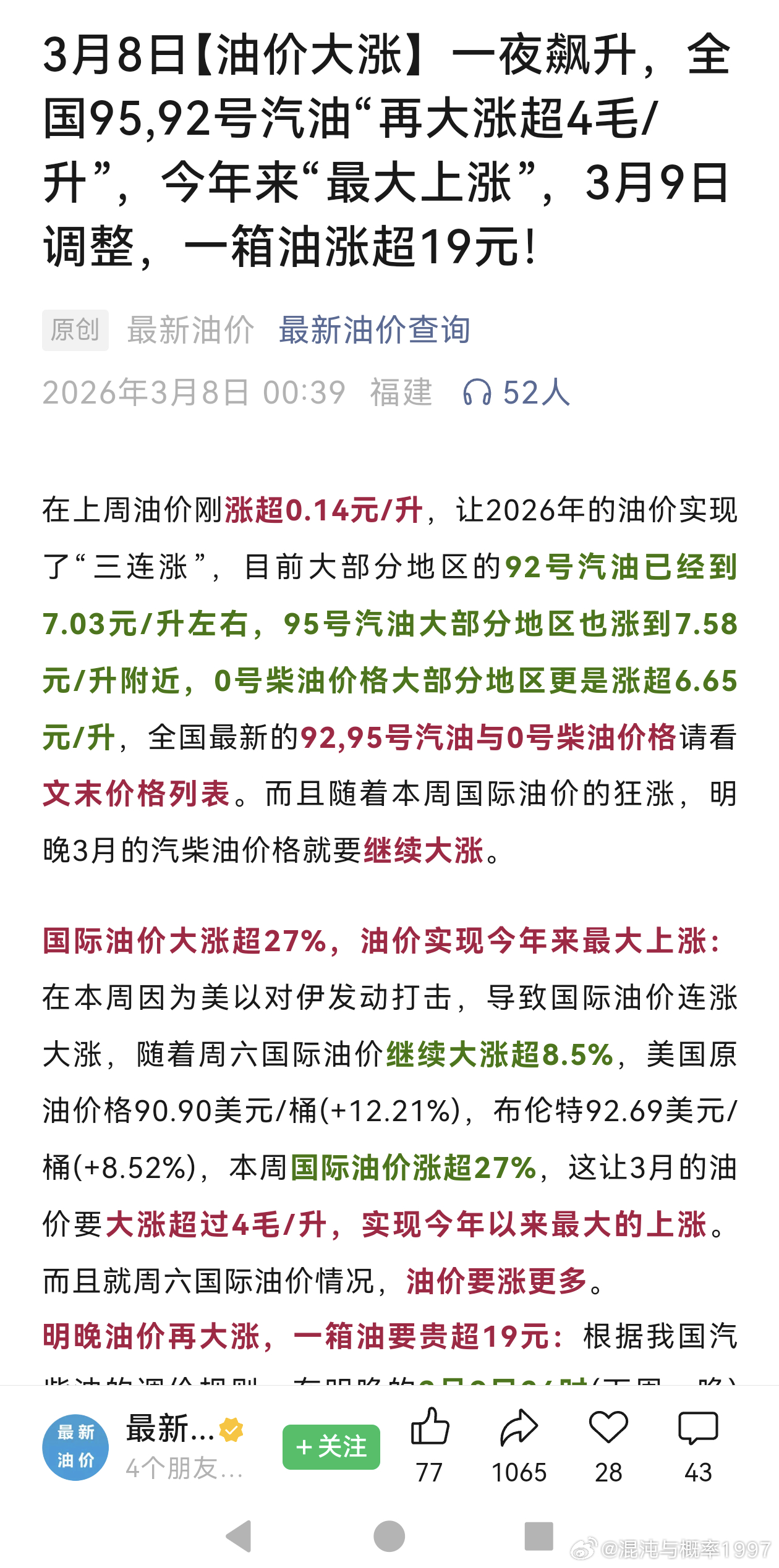 3月8日【油价涨了】一夜飙升,全国95,92号汽油“再大涨超4毛/升”,今年来“最大上涨”,3月9日调整,一箱油涨超19元!