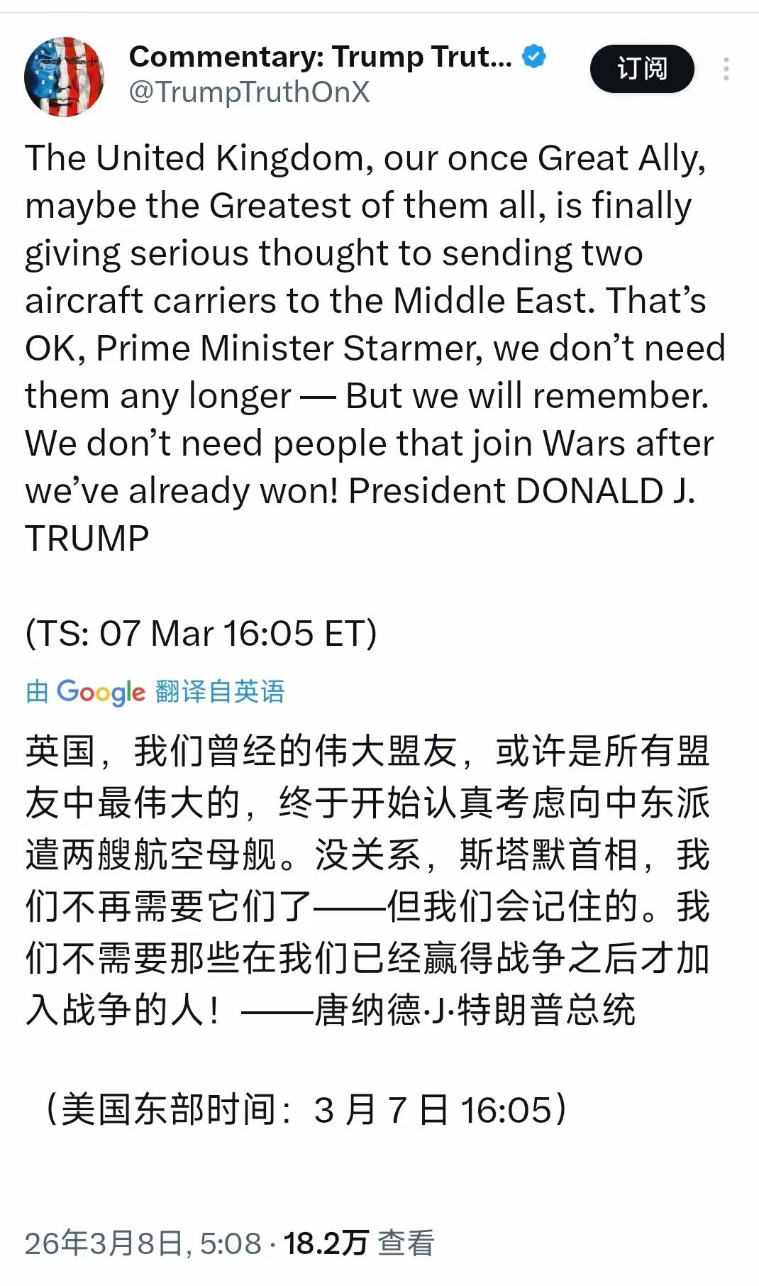 特朗普今天(北京时间3月8日)发文奚落斯塔默:“英国,我们曾经的伟大盟友,或许是