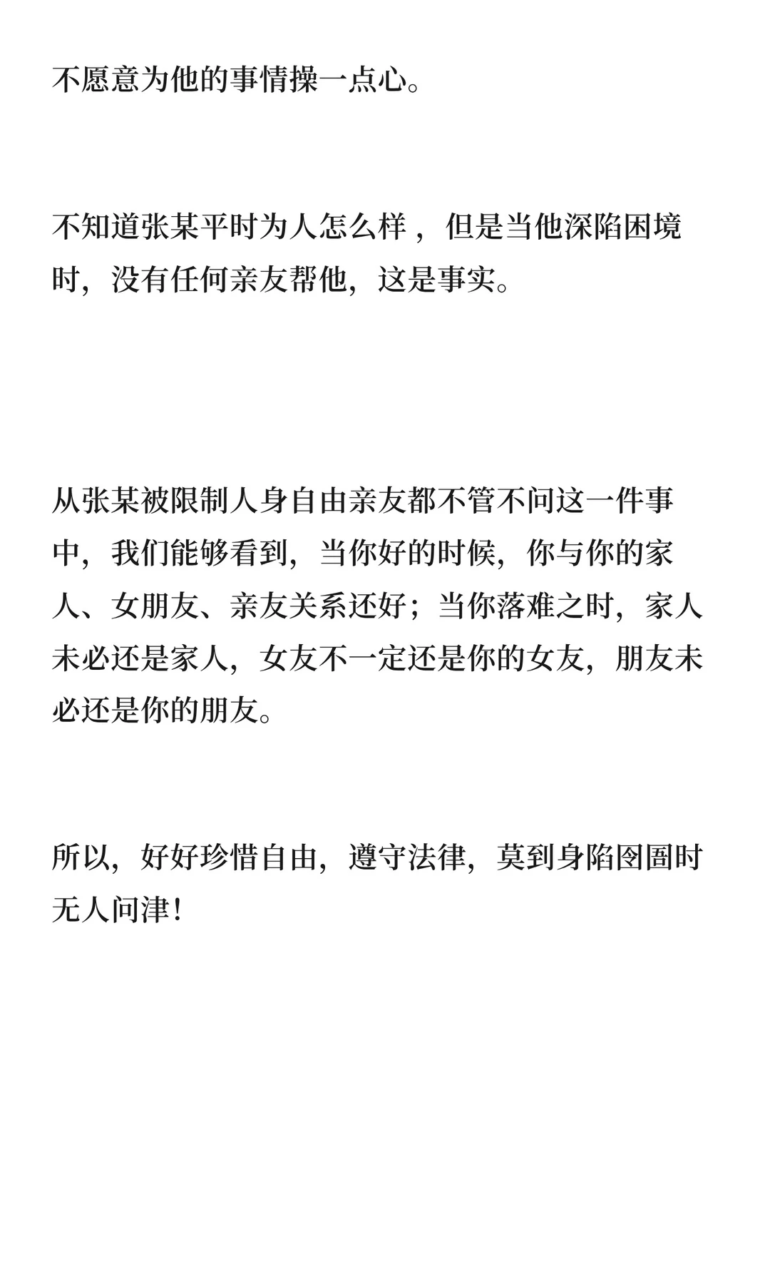 曾存钢律师分享了一起案件,当事人张某因重罪被羁押,亲友在关键时刻却选择不闻不问。张某的女友和女儿不愿介入,甚至看守所多次要求会见,亲友的冷漠让张某深陷困境,无人帮助。这段经历提醒我们珍惜自由,遵守法律,莫到关键时刻无人问津。