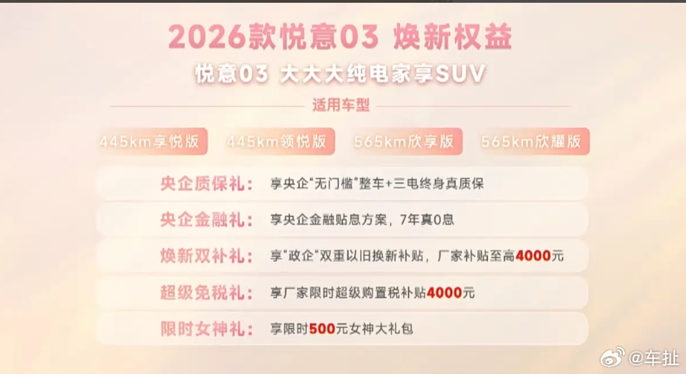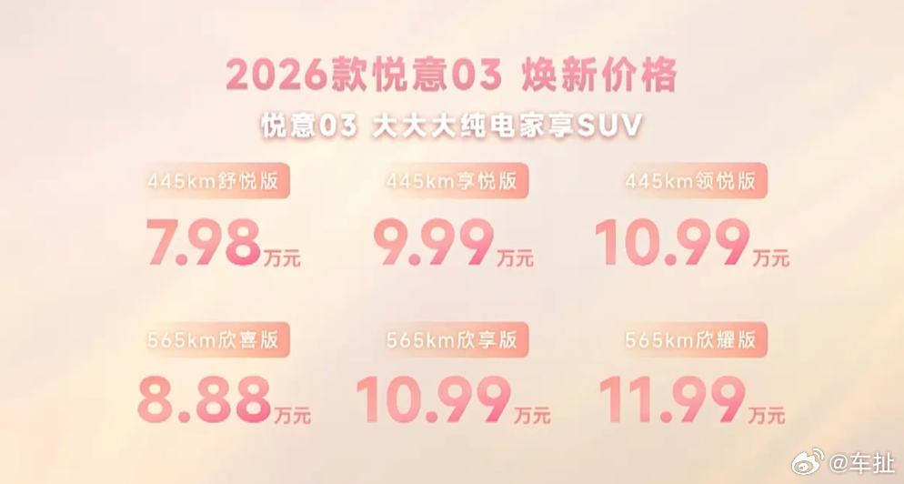 2026款悦意03正式上市,定位紧凑级纯电SUV,最长续航565公里。2026款车型带来了新配色,以及辅助驾驶、安全/舒适配置方面的20余项升级。另外官方也推出了时下流行的7年0息贷款政策,各位觉得这个价格和政策如何?