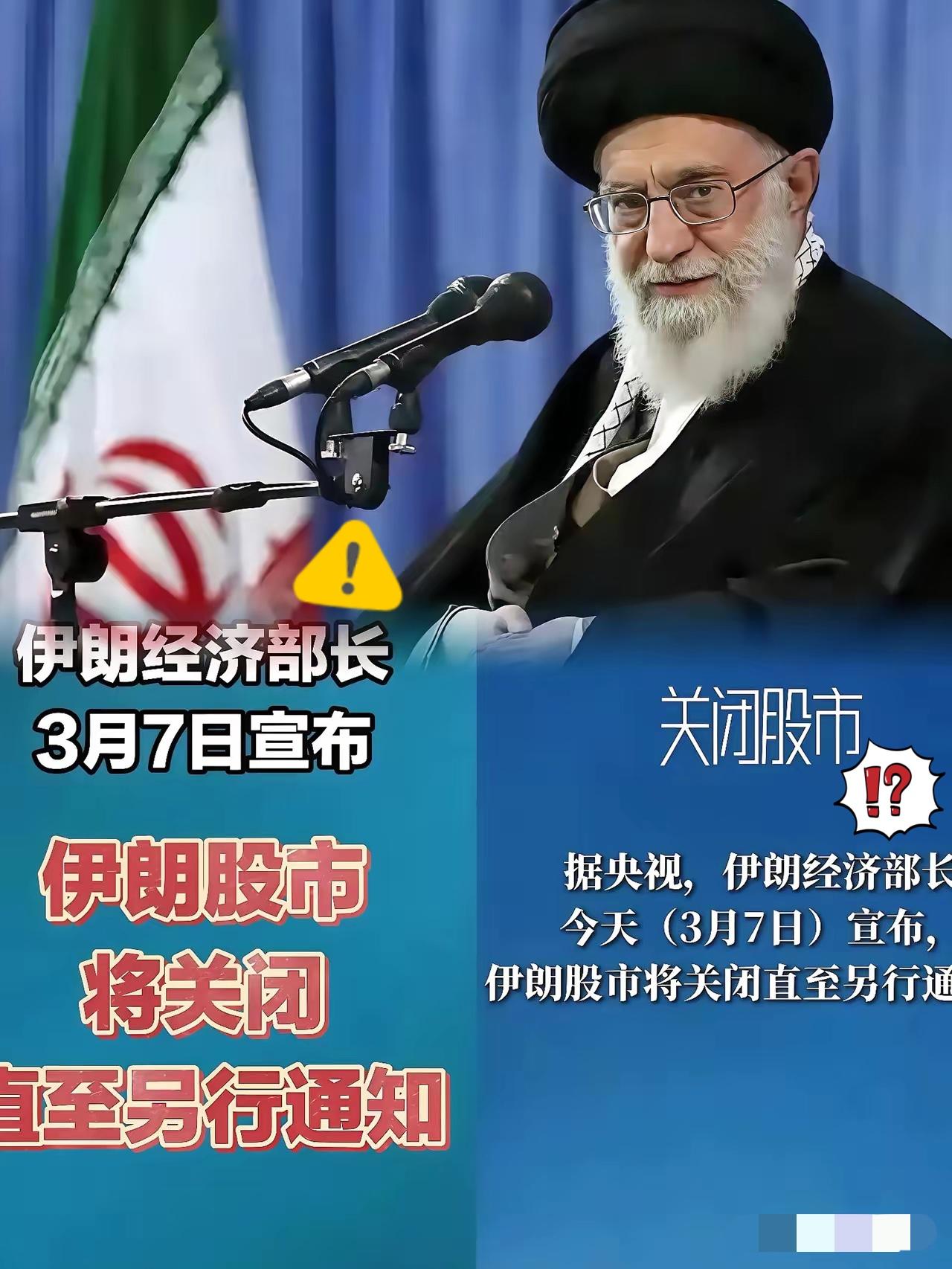 伊朗传来最新消息! 这一招“关门打狗”,看得我后背发凉。 伊朗股市直接无限期关闭,不是暂停,是彻底冻结。对于股民来说,那不仅仅是流动性枯竭,简直就是宣判了财富的死刑。你的钱还在账户里,但这串数字你动不了,只能眼睁睁看着它也许会变成废纸。 这个决定不是拍脑袋做的。3月1日伊朗股市先临时停市,仅仅六天后,局势逼得官方只能升级成无限期关闭。 伊朗经济部长阿里·马达尼扎德亲自官宣。官方说法很明确,就是保护公民和企业资产,扛住极端局势下的市场震荡。 背后的导火索是真刀真枪的冲突。3月7日当天,以色列八十多架战机空袭德黑兰,军事设施被炸,全国进入军事管制。 股市交易的基础全断了。空袭打坏电力和通信,交易系统随时瘫痪,投资者连准确信息都拿不到,开市就是崩盘。 这更是一场金融防御战。不锁死交易,股民会疯狂抛售,资本会换外币外逃,伊朗本就紧张的外汇储备会被瞬间掏空。 数百万伊朗股民被打了个措手不及。有人账户里是养老钱,有人是给孩子准备的学费,现在全变成了动不了的数字。 德黑兰证券交易所的大屏彻底黑了。往日喧闹的交易大厅空无一人,只剩冰冷的座椅和静止的设备,透着绝望。 别以为这是伊朗独一份。2022年俄乌冲突爆发,俄罗斯也曾无限期关闭股市,都是战时的无奈之举。 伊朗的经济本就脆弱。长期制裁叠加高通胀,里亚尔汇率一直跌,这场冲突更是把民生推到了更艰难的境地。 有个德黑兰的普通股民接受采访时哭了。他说不怕股价跌,怕的是连跌的机会都没有,这种无力感最磨人。 复市时间完全没谱。官方只说等通知,这意味着局势一天不缓和,大家的钱就一天别想动。 这场金融冻结,比战场上的炮火更让普通人揪心。它锁住的不只是财富,还有无数家庭的希望和未来。 伊朗政府同步启动了紧急经济计划。银行开始定向给食品、药品企业放贷,确保民生物资不出现断供。 物价管控小组已经进驻各大超市。米面油和药品的价格被直接钉死,发现哄抬物价的商家,当场就会被查处。 大学也全面转线上了。官方要求3月20日前都在家上课,减少人员聚集,也是为了应对可能的突发状况。 老百姓开始疯狂换黄金。里亚尔越来越不值钱,金条成了大家手里最踏实的“硬通货”,金店门口排起了长队。 企业的融资路被彻底堵死。上市公司没法增发股票,小公司的IPO计划全泡汤,只能靠政府的紧急贷款撑着。 周边国家也跟着紧张。阿联酋的股市紧急关了两天,怕伊朗的恐慌资金一窝蜂涌进去,把他们的市场也冲乱。 有位德黑兰的小企业主说,他的公司刚准备上市。现在股市一关,所有计划归零,只能先裁掉一半员工保命。 国际油价跟着大涨。市场担心霍尔木兹海峡出问题,伊朗的石油出口受阻,全球能源供应链瞬间绷紧。 就算将来复市,信心也难修复。股民们被这次冻结伤透了心,再想让大家把钱投回股市,恐怕要花好几年时间。 各位读者你们怎么看?欢迎在评论区讨论。