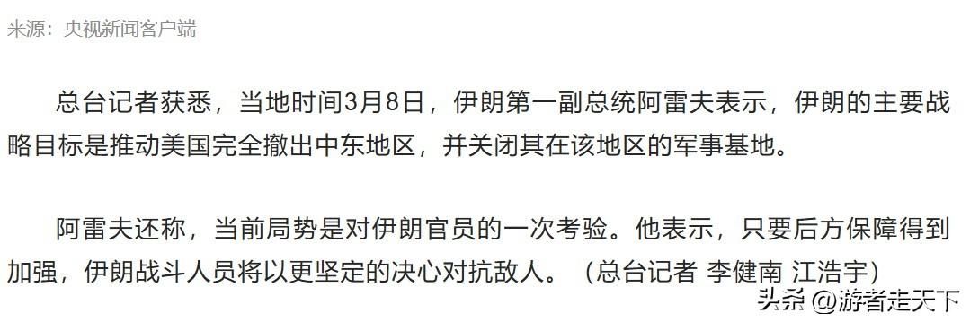 伊朗想让美军完全撤出中东,想想都不可能。 伊朗第1副总统阿雷夫说,现在伊朗的主要战略是推动美军完全撤出中东。 伊朗要是真这么做,不光以色列不会同意,中东这帮海湾石油富国也不会同意。 把美军赶走了,中东这些国家除了以色列有核武器的,伊朗奈何不了。剩下的有一个算一个,都不是个儿。 再加上伊朗本身在中东有不少小弟,美国一走,伊朗就会是中东霸主,完成对中东地区的整合,这绝对不是海湾几个石油富国愿意看到的情况! 除非美国从这里撤走之后,又有一个外部的顶级强国介入,代替美国的生态位。
