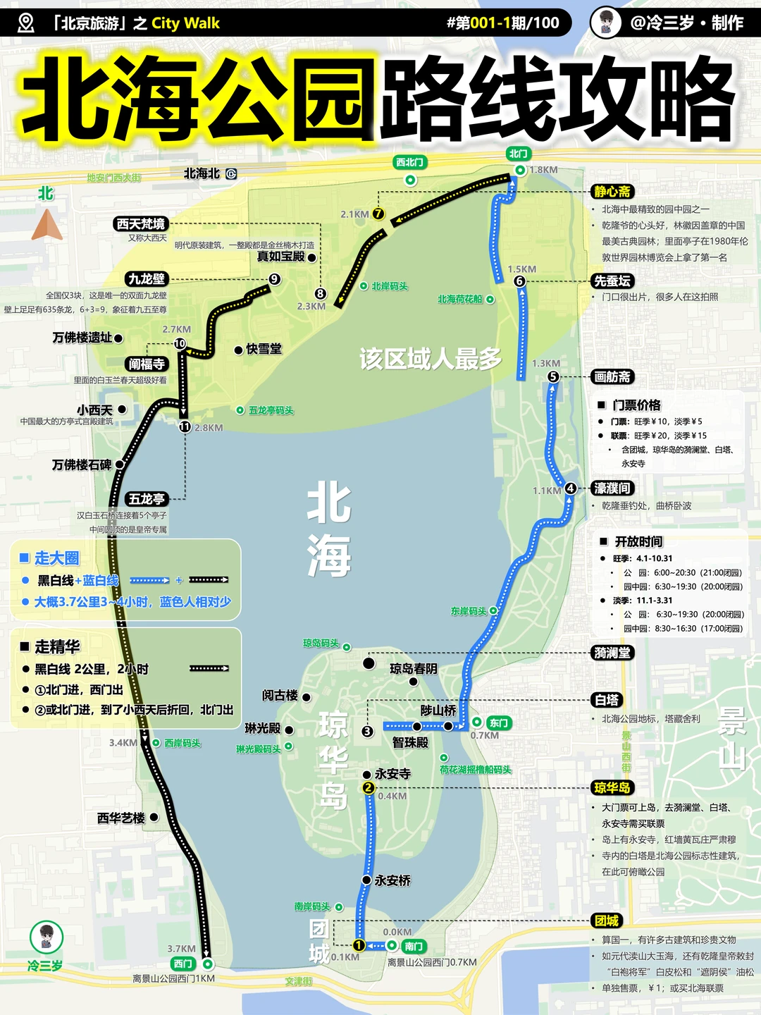 其实如果论花的品类,规模,好看程度 北海公园都不是非常出挑 但这里具备2个优势: 1.交通便利,在北京核心城区 2.有众多古建,有亭台楼阁,有大面积水面,可远观可近看 此外,花的品类也不算少 外地游客和本地人都会来这里 大概在3月中旬之后 这里的人就特别多了 预计3月底~4月爆满 除了故宫,这里格格最多[笑哭R][笑哭R] 为了方便大家更好的玩转北海公园赏花 我做了这张北海公园赏花地图,见图1 图2,是之前做的北海公园攻略,任何季节均可 聊回赏花,北海的主要看点: 1.山桃:3月中旬进入观赏期,琼华岛山顶和阐福寺山门前是观赏山桃的好去处,山桃与红墙碧瓦、白塔等古建筑相映成趣 看群里有人说,白塔附近有少量山桃已经开了 阐福寺、西岸码头(白塔机位),两个机位很好 2.玉兰:3月中到4月上,漪澜堂、小西天景区北侧、阐福寺 我去年春天去过2次,觉得还是玉兰还看 3.西府海棠:4月,北海公园西门内的海棠大道比较好看,从西门进就能看到。这个很火 4.木绣球,有颗很大的,在东门,去年还挺火的。