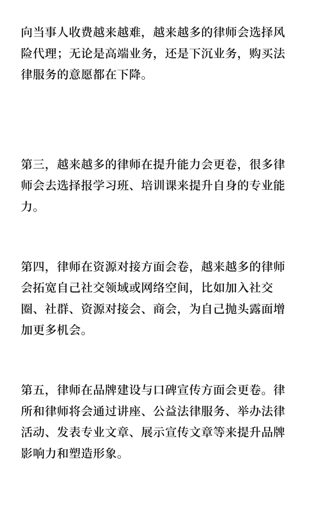 2026年律师行业将面临更激烈的竞争,网络推广、案件收费、专业能力提升、资源对接和品牌建设都将更加卷。律师需提升自身能力,深耕专业领域或寻求资本化运作,应对利润空间收窄和业绩压力。