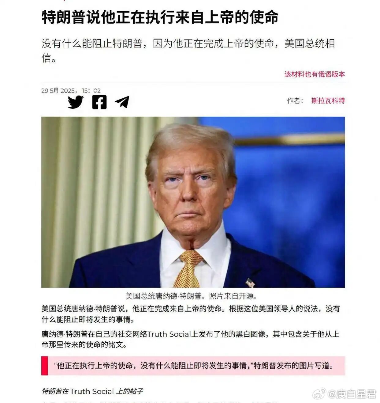 视频中,牧师们围绕在特朗普周围,将手搭在彼此身上,似乎在给予他力量。特朗普此刻邀请牧师祈祷,旨在通过宗教仪式传递“团结”或“希望”的信号,缓解公众焦虑,装腔作势给自己打气,实质上是掩饰自己的心虚和慌张。2024年特朗普遭遇刺杀后,特朗普开始利用上帝的名义为自己造势:“上帝饶我一命是有原因的,那就是拯救我们的国家。 ” “上帝拯救了我,是为了让美国再次伟大。 ”