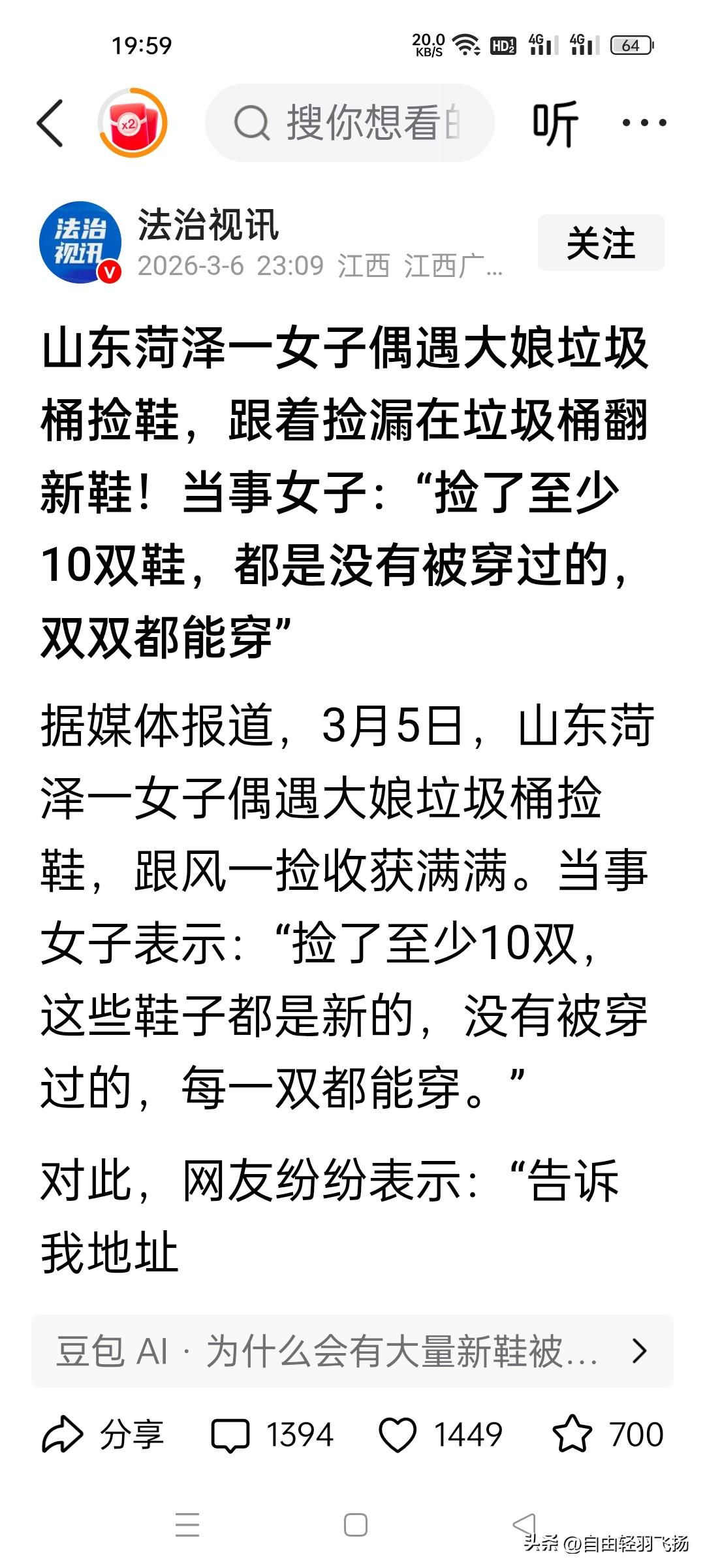 简直赚翻了!”3月5日,山东菏泽,一女子在街头,偶遇一位大娘正在垃圾桶捡鞋,出于好奇,她停下来观察,女子见状也动了心,便跟着大娘在垃圾桶“捡漏”,没想到最后她竟捡了至少10双鞋,并且都是没被穿过的! 3月5日,山东菏泽的街头,一位女子逛街时,远远看见个大娘在垃圾桶边翻找,手里还拎着几双看起来挺新的鞋子。她心里犯嘀咕:这垃圾桶里还能有好东西?好奇心驱使下,她停下脚步多看了两眼。 这不看不要紧,只见大娘从里面又掏出一双鞋,拍了拍灰,看着竟像没穿过的。女子心里一动,谁不爱捡便宜?可真要蹲在垃圾桶边翻,不少人拉不下脸。她犹豫了几秒,心想“试试又不亏”,也蹲下身跟着翻了起来。 这一翻,简直像打开了新世界的大门。先是摸出一双运动鞋,鞋底干干净净,鞋盒都还在;再往里探探,又拽出两双帆布鞋,标签都没拆。她越翻越起劲,最后一数,足足捡了10双鞋,竟全是没上脚的新鞋,码数也合适,自己穿、给家人穿都能用。 “这哪是捡垃圾,简直是淘宝贝!”女子又惊又喜,把这段经历拍下来发了网。视频里,那些被捡回来的鞋子摆了一地,看着跟商场货架上的没两样。 网友们瞬间炸开了锅,“这运气也太好了吧!”“我现在就想去家附近的垃圾桶转转!”有人说,这比开盲盒还刺激,你永远不知道下一秒能翻出什么。 为啥垃圾桶里会有全新的鞋子?有人猜,八成是周边商铺清库存。换季了,断码的、过季的,量少又占地方,扔了可惜,放垃圾桶边,算是给有需要的人留个方便。 还有人说,可能是运输时蹭了点灰、鞋盒破了角,商家觉得卖不上价,干脆就处理了。可换个角度想,这些鞋要是真被当成垃圾运走,多可惜? 一双鞋从布料、胶水到加工,多少工序在里面。就因为一点小瑕疵、一点库存压力,就成了“废弃物”,实在不值当。 有人觉得蹲垃圾桶捡东西“掉价”,可女子不这么想。“新鞋能穿,扔了才是浪费。”她在评论区说,自己小时候家里条件一般,穿的鞋常是哥哥姐姐剩下的,现在能捡到好鞋,既省钱又不浪费,挺好。 这话戳中了不少人,老一辈常说“新三年,旧三年,缝缝补补又三年”,现在日子过好了,可节俭这俩字,啥时候都不过时。那些被丢弃的新鞋,在需要的人眼里,就是宝贝。 其实不光是鞋子,商铺附近的垃圾桶里,偶尔还能见到全新的衣服、小饰品,甚至是包装完好的文具。商家嫌处理麻烦,路人嫌“不干净”,最后都成了垃圾。 可真有人愿意放下身段去“淘”,往往能有意外收获。有网友分享,自己曾在服装店门口捡到过带吊牌的牛仔裤,洗干净穿了两年;还有人捡到过没拆封的绘本,送给邻居家的孩子,孩子稀罕得不行。 这些东西,本不该被浪费。当然,捡东西也得有分寸。不能乱翻垃圾、弄脏环境,更不能惦记别人特意放在一边的物品。像菏泽这位女子这样,捡的是明显被丢弃的、干净的东西,既没给别人添麻烦,又让物品有了新用处,其实是件好事。 这件事也给商家提了个醒:库存处理不一定非得扔。摆个“低价处理”的小摊,或者捐给公益组织,既能清库存,又能积点善缘,比直接丢垃圾桶强多了。 说到底,东西好不好,不在于是从商场买的还是垃圾桶捡的,而在于它有没有被好好利用。一双新鞋,在垃圾桶里是垃圾,穿在脚上就是温暖;一件衣服,堆在仓库是负担,送给需要的人就是心意。 菏泽女子捡鞋的视频火了,火的不只是“捡漏”的运气,更是那种不浪费、不矫情的生活态度。下次路过商铺垃圾桶,你要是看到被丢弃的新东西,会不会也动心试试?说不定,你也能捡到属于自己的“惊喜”呢。 信息来源:@法治视讯