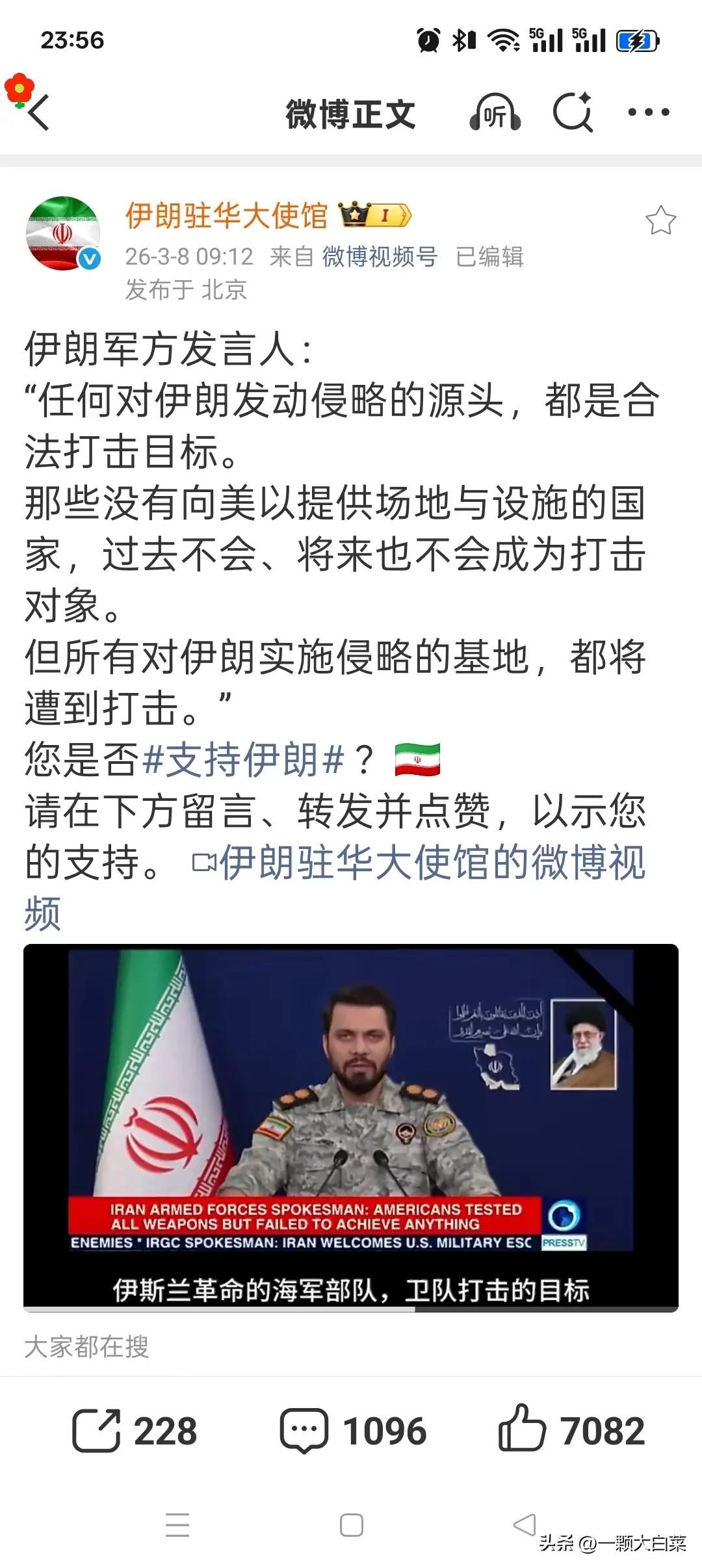 伊朗军方重磅发声!3月8日最新警告,字字铿锵! 伊朗驻华大使馆发布军方发言人最新讲话,配视频公开表态,信息量拉满! 原话如下: “任何对伊朗发动侵略的源头,都是合法打击目标。 那些没有向美以提供场地与设施的国家,过去不会,将来也不会成为打击对象。 但所有对伊朗实施侵略的基地,都将遭到打击。” 这话说得再明白不过了。伊朗军方这是在划红线,而且是拿着红笔对着地图在划。警告的对象非常明确,就是美国在中东那一圈军事基地,从卡塔尔的乌代德空军基地,到阿联酋的哈弗拉基地,再到巴林的贾法勒海军基地,一个都跑不掉。潜台词很直接:谁敢把基地借给美国或以色列用来打我,我就打谁。谁不掺和,谁就安全。 伊朗这不是在吹牛。看看他们的导弹库,“法塔赫”高超音速导弹、“霍拉姆沙赫尔”中程弹道导弹,射程覆盖整个中东,精度越来越高。去年用导弹打击巴基斯坦境内目标,已经展示了远程精确打击能力。这次警告等于公开说,这些导弹下一步对准的,就是那些允许美军战机起飞轰炸伊朗的机场和港口。 这份警告的高明之处在于“分化”。中东国家现在处境微妙,一边是美国的安全承诺和军事存在,另一边是伊朗的导弹和地区代理人网络。伊朗明确告诉这些国家:选择权在你们手里。继续为美军提供跳板,你的国土就会变成战场;保持中立,就能躲过战火。这是把压力从德黑兰转移到了华盛顿的盟友身上,迫使沙特、阿联酋这些国家重新盘算,为了美国到底值不值得把本国基础设施置于伊朗的瞄准镜之下。 从军事专业角度看,伊朗采取的是“反介入/区域拒止”战略。简单说,就是让对手的军事基地在开战初期就丧失功能。现代战争打的是后勤和基地,战机需要机场,军舰需要港口。伊朗拥有中东最庞大的导弹武库,数量超过3000枚,第一波饱和攻击就足以让大部分邻近美军基地瘫痪。这份警告是先礼后兵,把战术意图公开,反而增加了威慑的可信度。 现实影响已经显现了。阿曼湾附近,伊朗革命卫队的海军快艇明显加大了巡逻力度。霍尔木兹海峡是全球石油运输的咽喉,每天有近2000万桶原油经过这里。伊朗不需要真的开火,只要加强军事存在,国际油价就会应声波动。这就是伊朗手中的“软实力”,军事警告直接影响全球经济神经。 更深一层看,这是伊朗在测试美国的决心。拜登政府现在焦头烂额,中东局势、俄乌冲突、国内大选,哪头都火烧眉毛。伊朗选在此时发出最强音,就是看准美国可能无力开辟“第二战场”。美国在中东的航母打击群是厉害,但伊朗的数千枚导弹和遍布地区的盟友网络也不是摆设。真打起来,整个波斯湾的油轮都得停航,那时全球经济的代价,美国未必承受得起。 对于地区国家来说,这是道棘手的选择题。一边是传统安全伙伴美国,另一边是近在咫尺的伊朗。沙特和伊朗去年才在中国斡旋下和解,现在肯定不想重回对抗。阿联酋一直在外交上走平衡木,既配合美国,又和伊朗保持对话。伊朗的警告逼着他们表态,想两头讨好越来越难了。 中国的立场很关键。伊朗选择通过驻华大使馆渠道发布信息,本身就有深意。中国是伊朗石油的最大买家,也是地区和平的重要斡旋方。中国始终强调通过对话解决争端,反对任何导致局势升级的行为。伊朗的强硬警告虽然是对美以发出的,但也希望国际社会,特别是中国,能理解其维护主权安全的底线。 局势走到这一步,就像两个高手在对峙,谁也不愿先动手,但谁也不敢后退。伊朗的警告把球踢到了美国及其盟友的半场。接下来要看华盛顿怎么接招,是继续施压,还是坐下来谈。更值得关注的是中东各国的反应,他们是会悄悄限制美军基地的使用权限,还是继续绑在美国的战车上?这个选择,将决定整个地区的战争与和平。 各位读者你们怎么看?欢迎在评论区讨论。