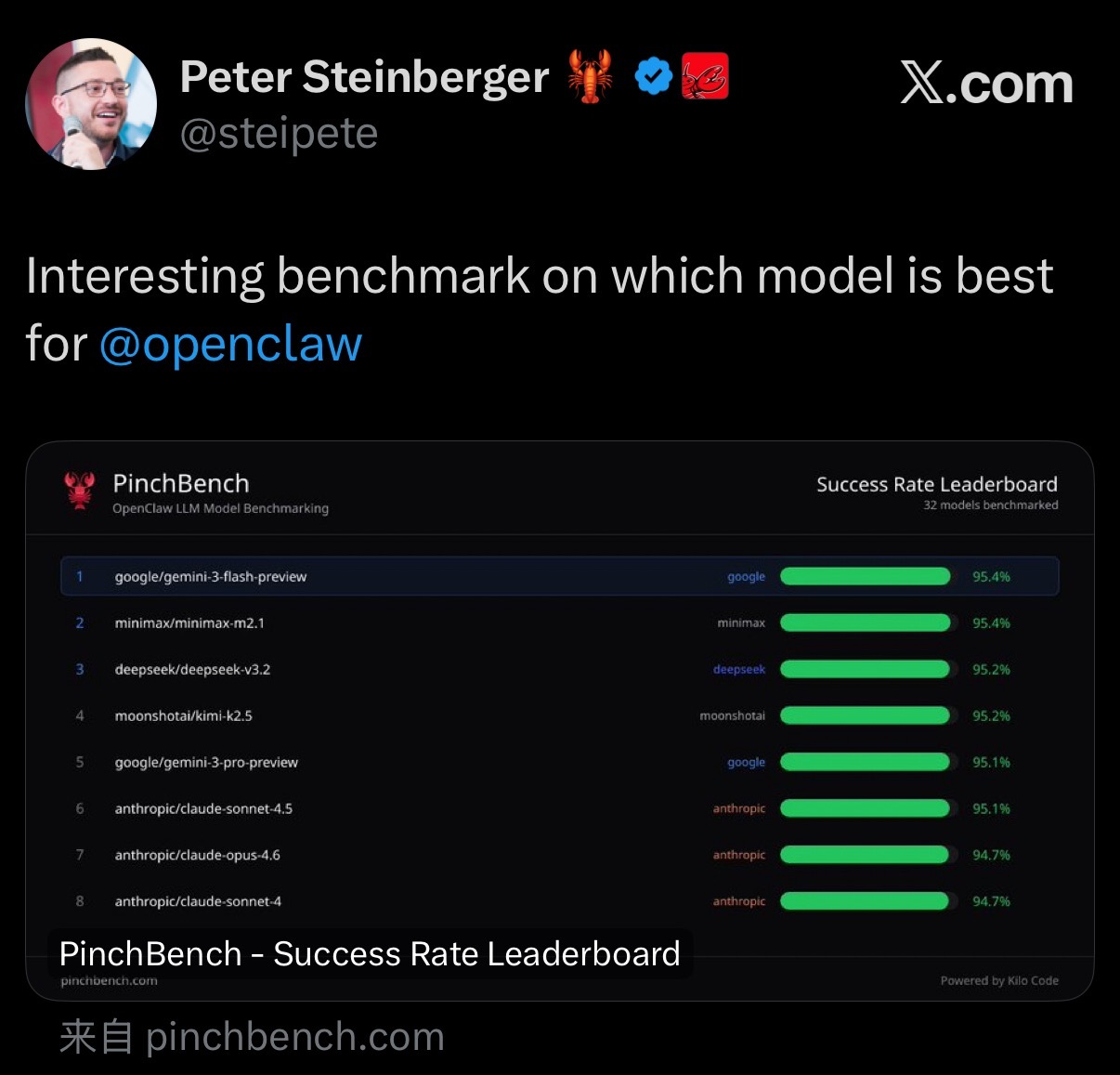 先看openclaw他爹Peter刚转发的,一个针对openclaw的benchmark测试排名。
