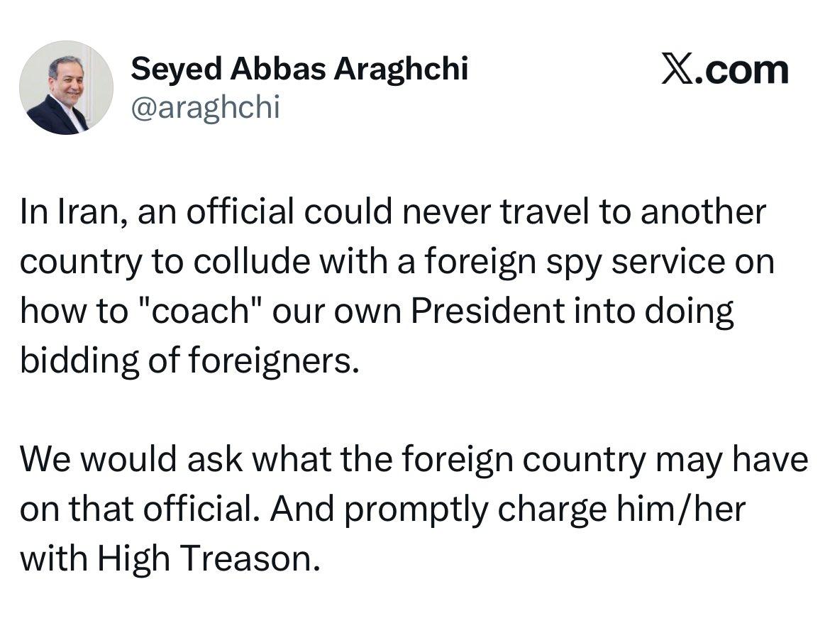 新闻快讯——伊朗外长赛义德·阿巴斯·阿拉克奇发文称: “在伊朗,任何官员都绝不可能前往他国,与外国间谍机构勾结,谋划如何‘教唆’本国总统为外国势力效劳。 我们会彻查该外国势力掌握了这名官员的何种把柄,并立即以叛国重罪对其提起指控。” 消息来源——伊朗外交部长阿巴斯·阿拉格奇2026年3月8日于他的官方X账号发布
