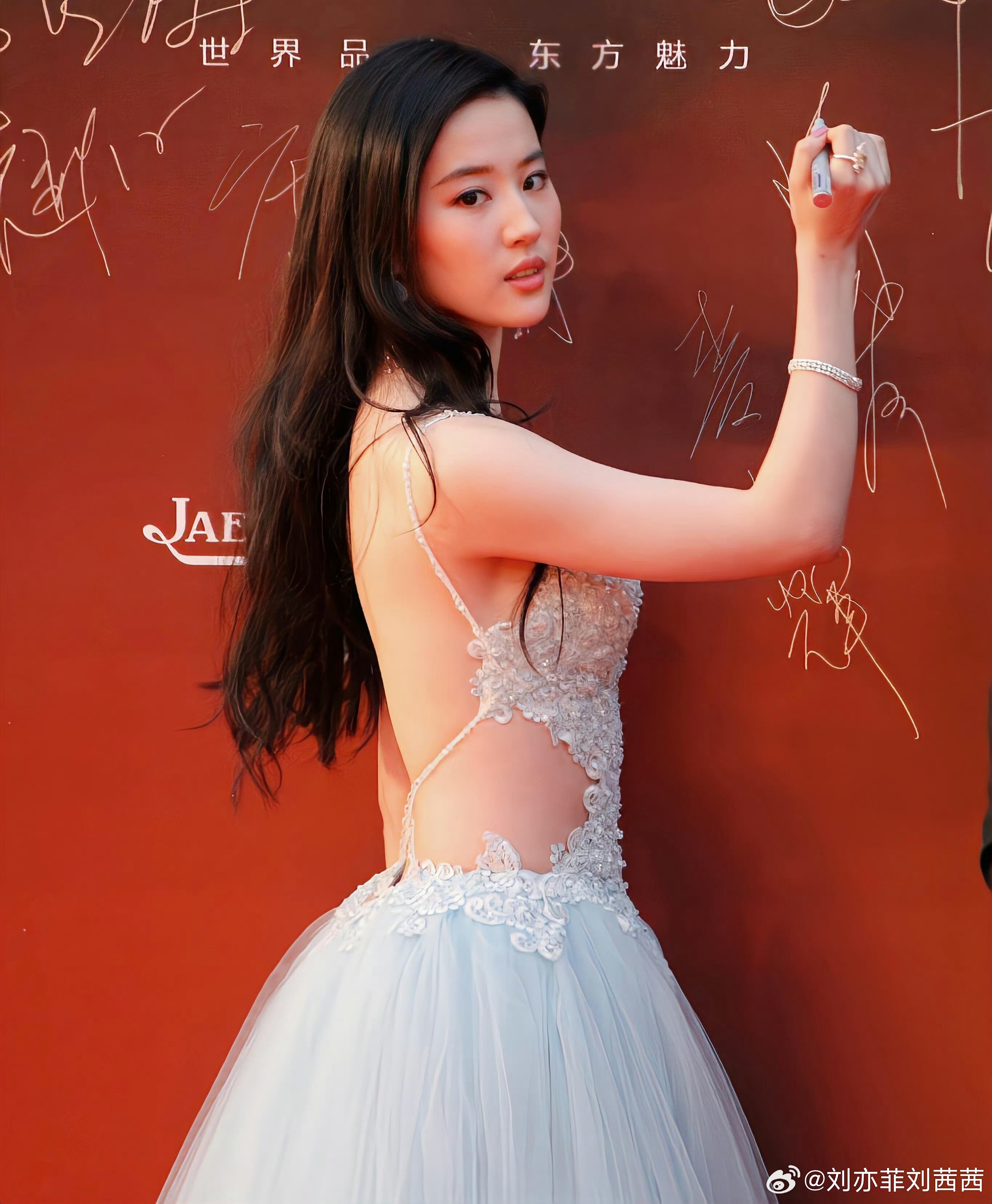 刘亦菲之前红毯造型堪称惊艳,一袭浅蓝纱质礼服,上半身精致银白蕾丝与水钻刺绣,勾勒出柔美曲线,大胆的露背与侧腰镂空设计,更是增添了一丝性感与灵动。