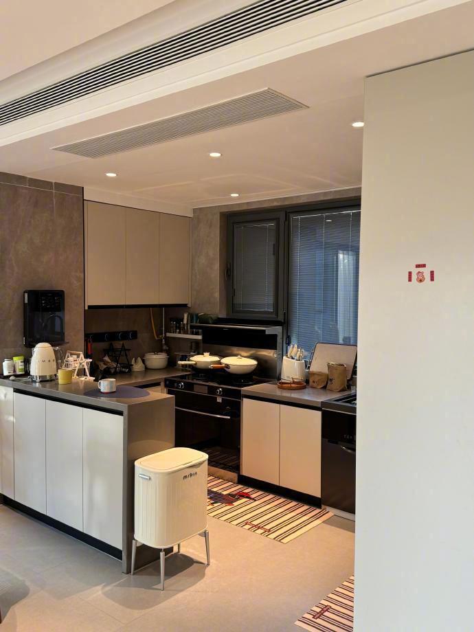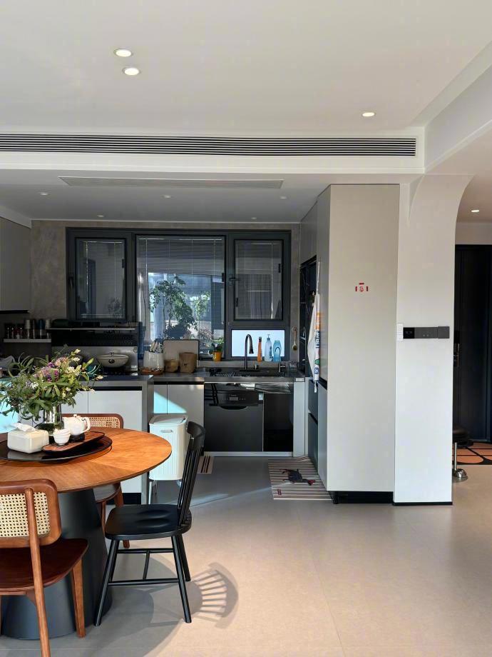 打通阳台和厨房后的横厅效果…室内110平奶油风给大家参考