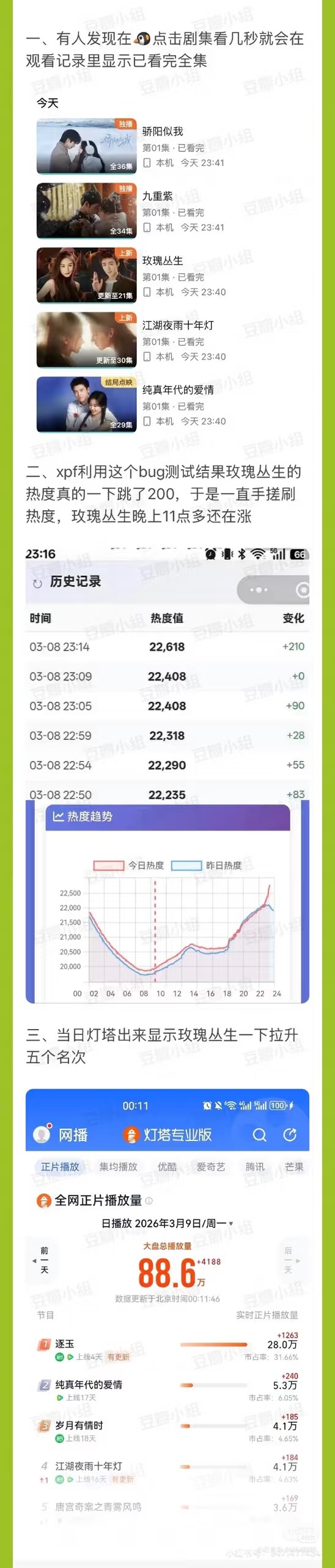 哇,捂嘴锁广场了,腾讯爱奇艺这两家上市公司,就这么热度造假骗广告商,你们真不怕上315晚会吗?大流量粉丝手搓半小时就能涨1000多热度,可想而知太子剧这几天是怎么狂飙的,你们捧飞舞真是月佥都不要了。