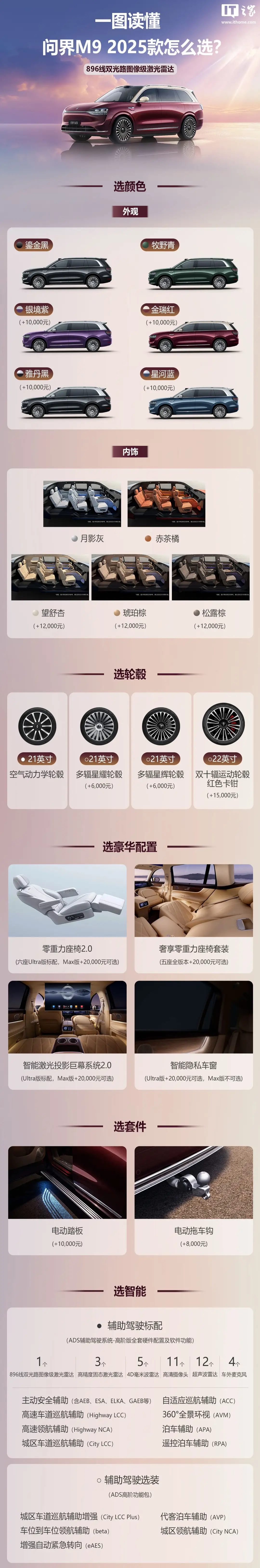 - Max版车型 :标配全铝合金底盘、华为ADS高阶辅助驾驶系统以及896线双光路图像级激光雷达。 - Ultra版车型 :在Max版基础上,升级配备百万像素智慧投影大灯与智慧电动门。