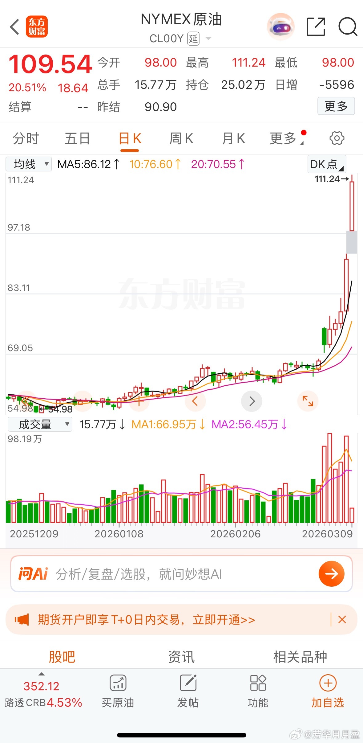 上周五晚原油大涨,今早一看继续大涨,果真到了100美元以上。这表明美伊战争升级的趋向,可今早美黄金不涨反跌,日经已大跌6个多点。