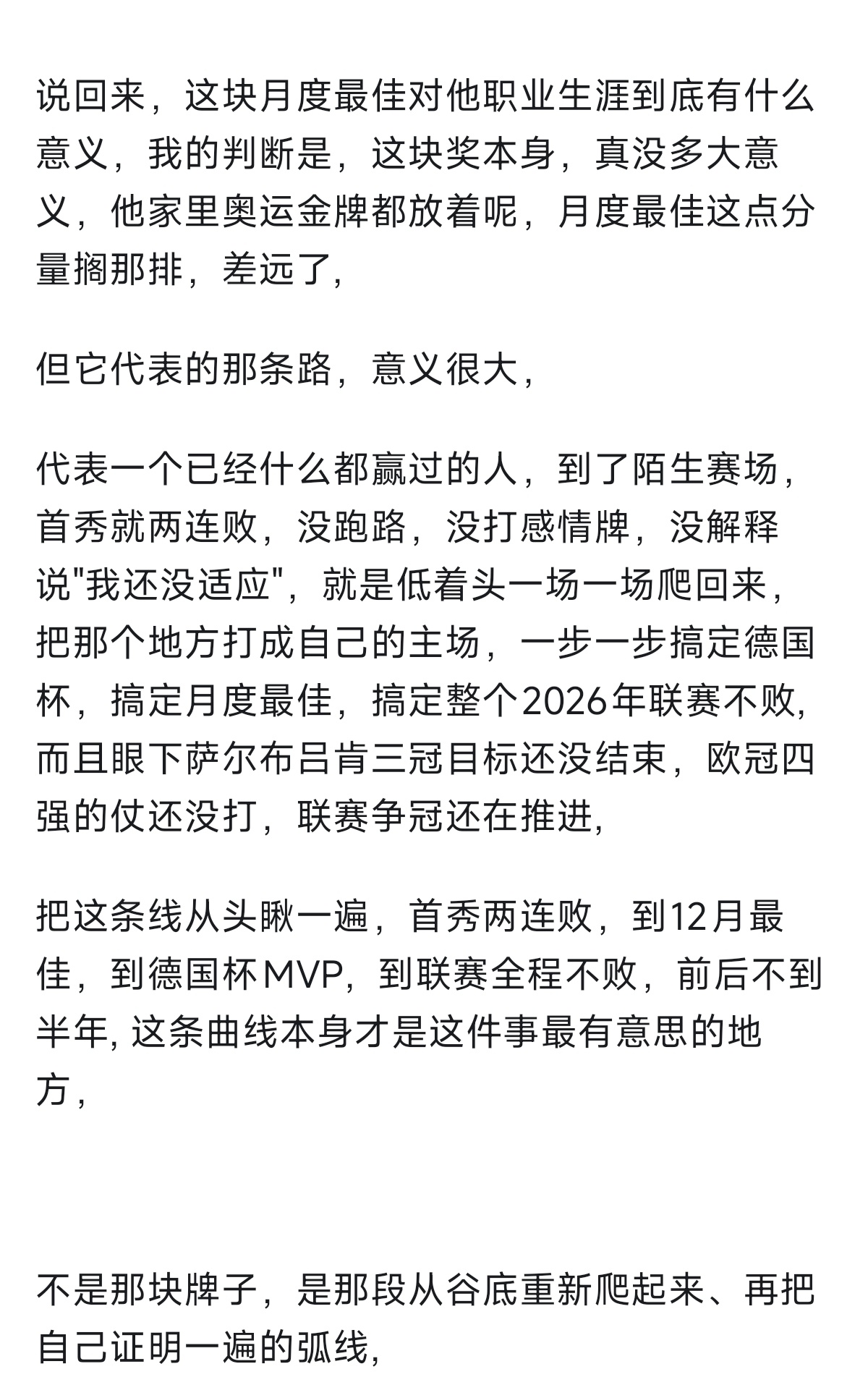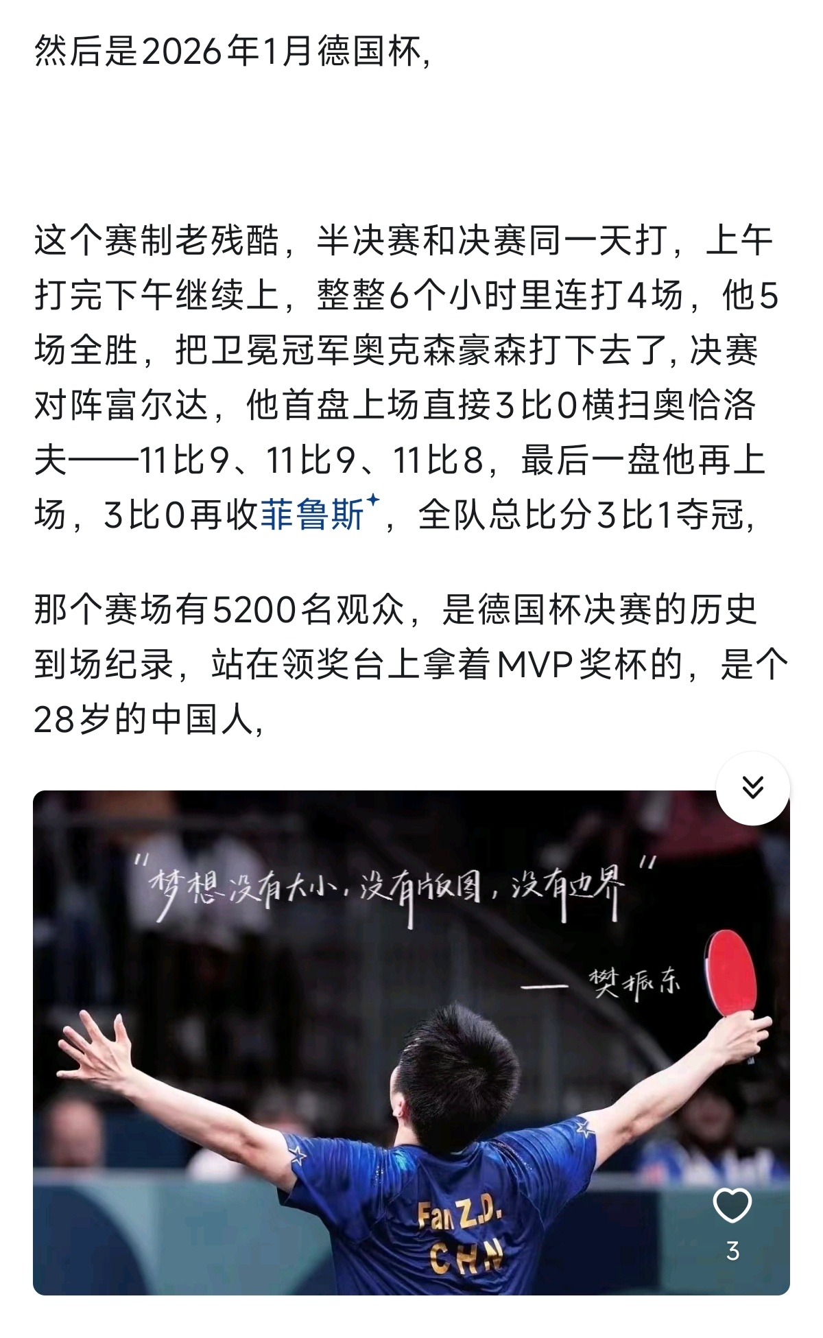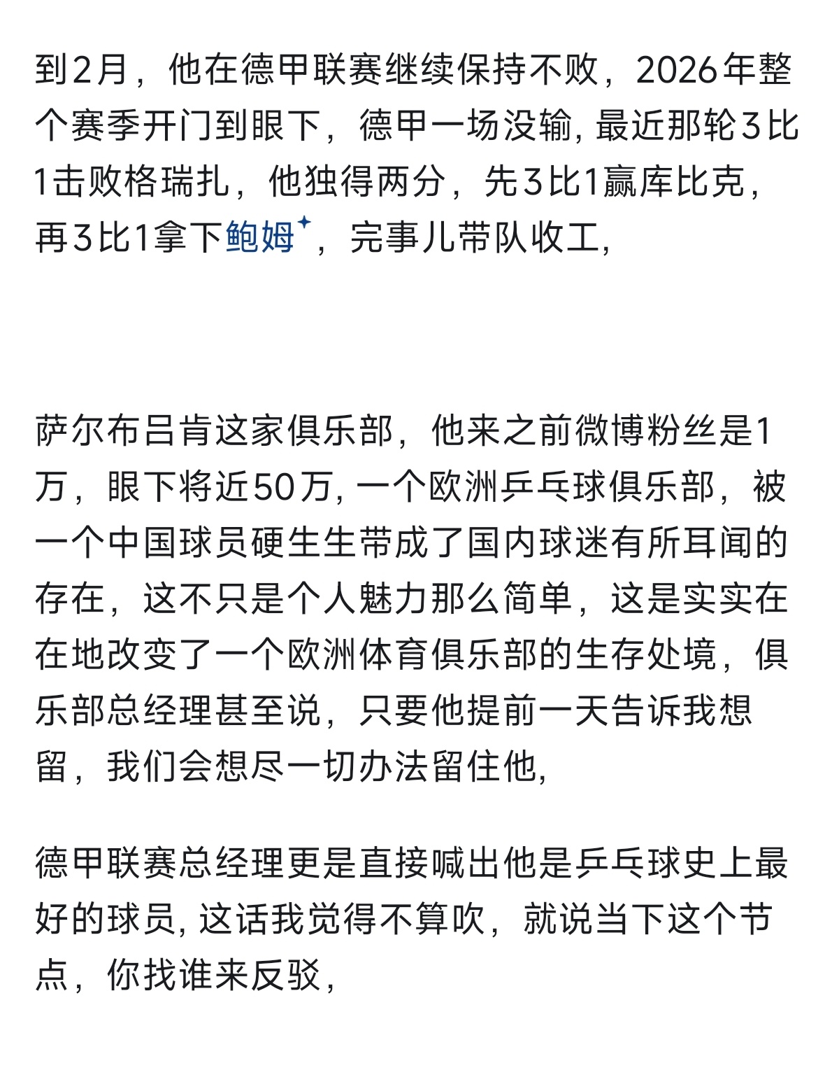 把樊振东德甲这条线从头瞅一遍,首秀两连败,到12月最佳,到德国杯MVP,到联赛全程不败,在到二月份最佳,前后不到一年时间,这条曲线本身才是这件事最有意思的地方,不是那些名头,而是那段从谷底重新爬起来、再把自己证明一遍的弧线。