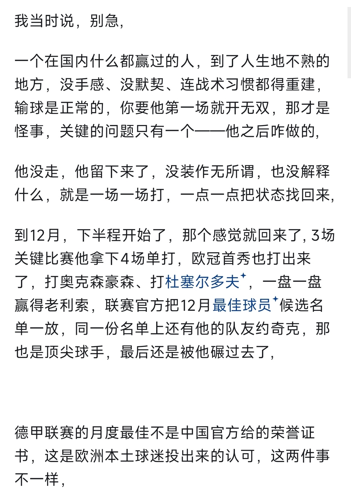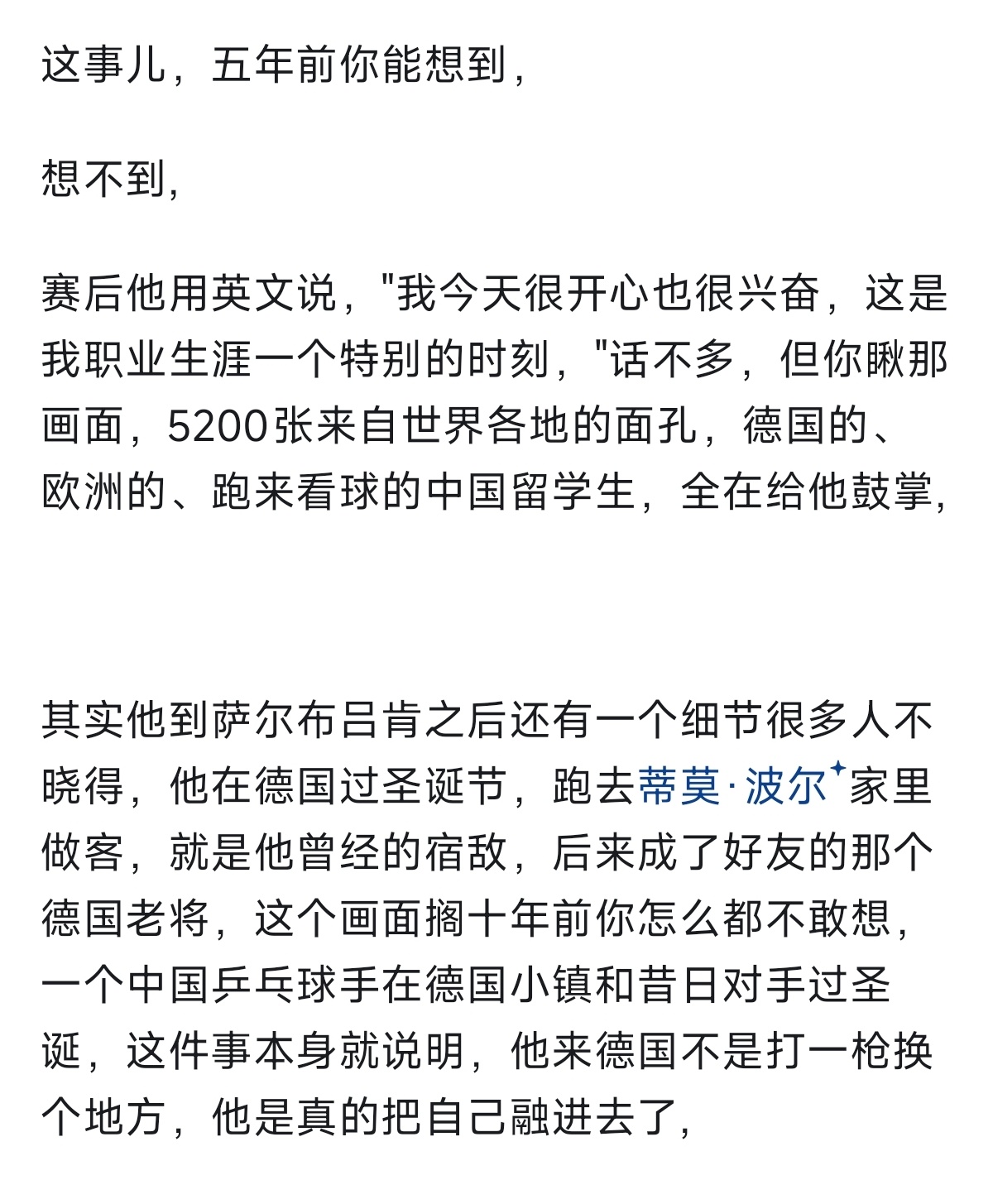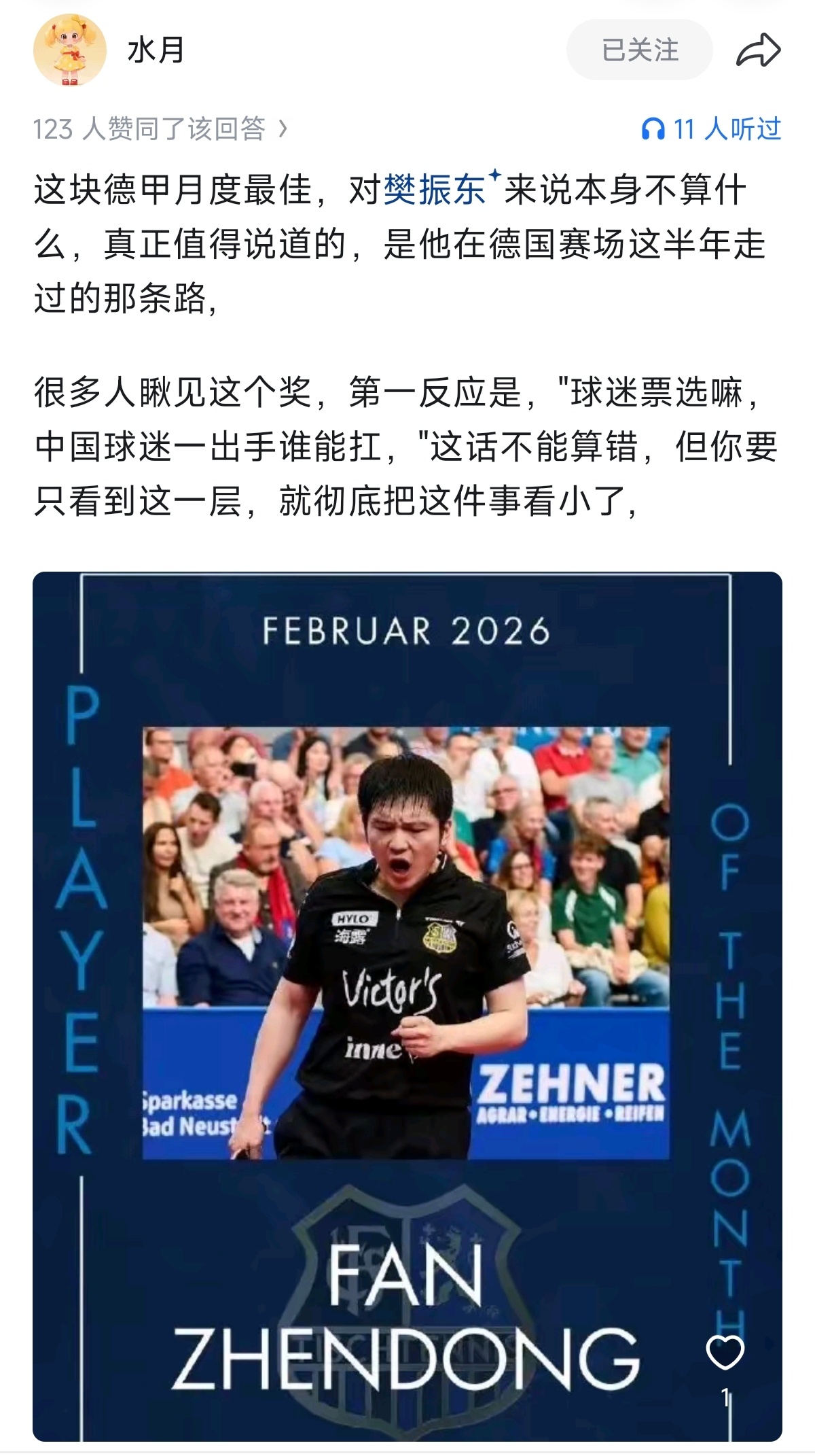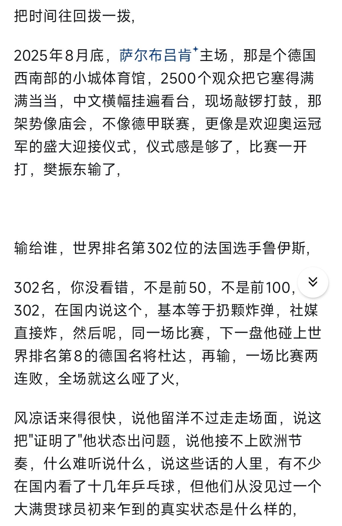 把樊振东德甲这条线从头瞅一遍,首秀两连败,到12月最佳,到德国杯MVP,到联赛全程不败,在到二月份最佳,前后不到一年时间,这条曲线本身才是这件事最有意思的地方,不是那些名头,而是那段从谷底重新爬起来、再把自己证明一遍的弧线。