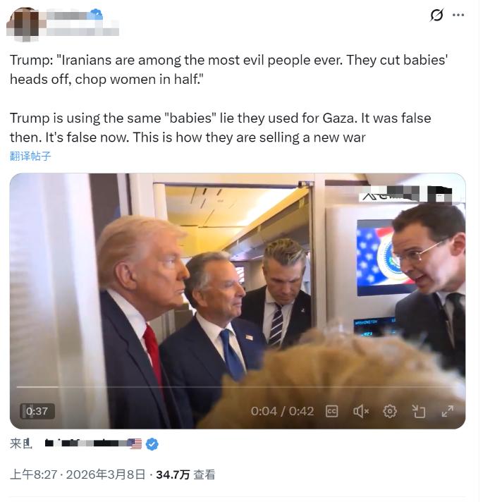 特朗普疯了?他竟称:“伊朗人是史上最邪恶的民族之一。他们会砍婴儿的头,把女人劈成两半。”3月7日,特朗普在飞机上的一段视频被曝光,言语之间满是煽动与仇恨。不敢想象,这样的话竟然出自一个大国总统之口。 说白了,特朗普在飞机上放出的那些极端言论,表面看是他一贯的煽动与口无遮拦,实则是为了掩盖军事行动受挫、国内舆论承压的狼狈,更是用种族仇恨转移矛盾、给极端立场找借口。 要知道,这可不是普通的竞选话术或随口吐槽,而是一个大国总统对整个民族的恶意抹黑与人格侮辱。“砍婴儿的头、把女人劈成两半”这类指控毫无事实依据,完全是凭空捏造、恶意中伤,既违背基本的人道主义常识,也践踏了文明社会的底线。 可这绝非简单的失言,而是戳破了美国所谓“人权卫士”的虚伪面具。多年来,美国动辄以“人权”“民主”为名干涉他国内政,对他国指手画脚,却对自己内部的种族歧视、暴力冲突视而不见,如今却用最肮脏、最恶毒的语言攻击一个主权国家的人民,这种双重标准暴露无遗。 更关键的是,这番言论狠狠打脸了那些试图美化美国霸权的人。美国口口声声说要维护地区和平,却不断升级冲突、扩大打击范围;口口声声说尊重人权,却对伊朗平民的伤亡漠不关心,甚至用种族仇恨煽动对立,这种虚伪与霸道,只会让国际社会更加看清其真面目。 说实话,这也是对国际公理与人类良知的践踏。每个民族都有自己的尊严与历史,都值得被平等对待,用极端言论抹黑一个国家的人民,不仅解决不了任何问题,只会加剧对立、破坏和解的可能,最终伤害的是地区和平与稳定。 要清楚,谎言永远掩盖不了真相,仇恨也换不来真正的胜利。特朗普的极端言论,只会让美国在国际上更加孤立,让美伊冲突的解决更加艰难;而伊朗人民不会被恐吓、不会被抹黑,只会更加坚定地捍卫自己的国家与尊严,这是任何恶意中伤都无法改变的事实。 并且,历史上所有靠抹黑、煽动、霸权解决问题的做法,最终都会被历史唾弃。美国试图用种族仇恨掩盖自身的战略失误,用极端言论逃避自身的责任,这种短视与卑劣,只会让其失去更多信任与支持,太得不偿失。 而未来,随着真相的传播与国际社会的清醒,特朗普的这种极端言论只会越来越没有市场。关键转折点就在于美国是否能放下霸权思维、停止抹黑攻击,回到理性对话的轨道上,否则只会在错误的道路上越走越远,最终自食恶果。 说到底,特朗普的这番言论,本质上是霸权失势后的疯狂反扑,是对文明底线的公然践踏。一个大国总统,不去致力于解决冲突、维护和平,反而用最恶毒的语言攻击他国人民,这种行为不仅丢人,更会让美国的国际形象一落千丈。真正的强大,从来不是靠抹黑与煽动,而是靠尊重与担当,这是颠扑不破的真理! 以上是小编个人看法,如果您也认同,麻烦点赞支持!有更好的见解也欢迎在评论区留言,方便大家一同探讨。