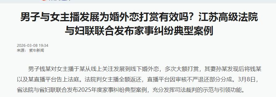 江苏,一已婚男子因经常打赏一位女主播,获得了女主播的青睐,二人不仅奔现,还发生了性 关系。在二人偷偷交往期间,男子又多次大额打赏女主播。然而此事终究被男子的妻子发现。后男子妻子向法院起诉要求认定男子对女主播的打赏行为无效,且返还的打赏应当归男子妻子个人所有。法院判了! 先说说案子的基本人物关系,有点像电视剧,但都是活生生的人在现实里摔打过来的。 男主钱某,结婚多年,有家有老婆(孙某),日常平凡,但是自从某天刷到主播于某的直播间之后,一切都变了。 从关注、互动,到后面成了榜一大哥,甚至4个月就冲上榜一,这速度可以说相当卷了,大家懂得都懂,没有真金白银砸进去,这位置到不了。 钱某为啥这么舍得?一堆原因,或许寂寞,或许刺激,有些心理东西也挺复杂,总之从一开始的“为爱打赏”,最后变成了现实中的见面奔现,而且发生了实质关系。 有朋友问,平台和主播怎么分钱?这点非常关键,直接决定案子最终怎么判。 其实大多数直播平台在法律上是有分账协议的,主播拿40%,平台拿剩下的大头。 钱某大把打赏的过程中,于某做了什么?明知钱某已婚,还一直和他保持暧昧,甚至线下发生关系,继续诱导他“上贡”大额礼物。 于某的行为,可不是单纯赚钱这么简单,法院都认定了,这种具体诱导大额打赏、甚至鼓励已婚男人拿家里公共财产挥霍的行为,绝对是有过错的。 钱某呢?作为成年人,他确实也是自愿把钱花进去了,但他犯了最根本的错:用的是夫妻共同财产,而且老婆完全不知情。 事情闹到法庭上,其实就是因为钱某的老婆孙某查账发现不对劲,钱流向一查彻底震惊,夫妻之间的信任直接崩了。 这是为什么?因为在我国法律里,夫妻共同财产动用到一定额度,超出家庭正常消费范围,是要两个人同意的。 钱某就是这样瞒着老婆,一股脑挥霍出去的,这点让不少网友都说“大哥,你这是何苦”。 说白了,家不是一个人的家,钱也不是一个人的钱。 直播平台能免责吗?这回也有点不一样。 法院认定平台也有“连带责任”,理由很直接:平台对大额刷礼物行为没有风险提示,也没有在主播明显违规(诱导、性暗示、穿着暴露等)时进行有效监管。等于说,平台成了“放任者”甚至是“隐性推手”。 直接点讲,平台为利益睁一只眼闭一只眼,这样的监管,就是失职。 这个案子法院让平台返还30%的获利,是有警示意义的:平台没法躲在协议、分账后台后面装无辜,必须要对用户的消费行为、对主播的价值导向负起责任来。 说回这场争议的本质,其实是在考验法律底线、道德约束和网络灰色地带的底层规则。 钱某与于某,表面是单纯的主播和观众,实际背后已经超越“娱乐服务”或者“打赏互动”,演变成了侵犯权利的深度纠纷。 首先,法律要求夫妻共同财产的处分要双方知情并同意,尤其是面对“超家庭正常消费”的打赏。 夫妻之间的信任和共同财产的管理,不仅仅是感情问题,更是实打实的法定责任。 钱某的“大哥”身份,其实是在拿整个家庭的财产博“虚拟爱情”,甚至现实中也被骗,损失的不只是钱,连家人的信任都丢了。 再看于某,作为主播,本可以选择与每位观众保持常规关系,但这位明显界限模糊,明知男方已婚还继续交往,并诱导打赏,这种行为完全超出了普通职业主播应有的边界。 法院直接指出,这种明知对方已婚,甚至多次怂恿对方为自己大额消费的行为,是违背社会风尚、公序良俗的。 从现实角度讲,很多观众以为主播对你“有点意思”,背后其实还是生意买卖,涉及到家庭的道德风险、财产风险的时候,主播都是以盈利为核心。 主播职业本身没错,但所有诱导、越界、不正当交往,都已经不是单纯赚钱的正当方式了。 平台这个角色挺耐人寻味,手握流量和资本,却又经常主张“免责声明”,说用户“自愿刷礼物”。 抖音、B站、虎牙、斗鱼,这些头部平台,获利巨大,但在引导消费、打击违规内容上,往往是等社交舆论爆了、法院定案了才缓慢改进。 在本案里,平台也是部分责任方,被判返还30%的打赏收益。这个警钟,恐怕是敲给所有大流量平台的。 再来说下法律视角。我国现行《民法典》明确规定,违背公序良俗的法律行为无效。 在这起案件,法院把焦点放在了钱某与于某的不正当关系以及钱某私自使用家庭共同财产两个点上。 判定钱某未经妻子同意的大额打赏案行为无效。于某需要把她拿到手的全部提成返还给孙某,平台也要把那30%的分成返还。 这不仅仅是追回金钱那么简单,更重要的是宣示:夫妻共同财产不能由个人随意挥霍,婚姻外的感情交易,尤其是金钱诱导,也不能变成“灰色地带”。 参考: 手机光明网——男子与女主播发展为婚外恋打赏有效吗?江苏高级法院与妇联联合发布...