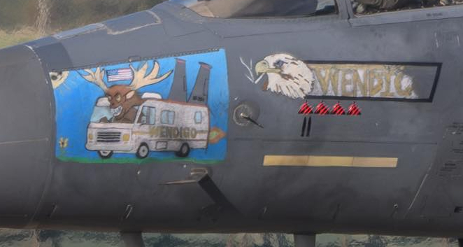 英国皇家空军莱肯希思基地的MD二等人F-15E机头涂鸦,一辆长着翅膀的巴士/货车,这架F-15E还拦截了四架伊朗“见证者”自杀无人机。美伊以冲突