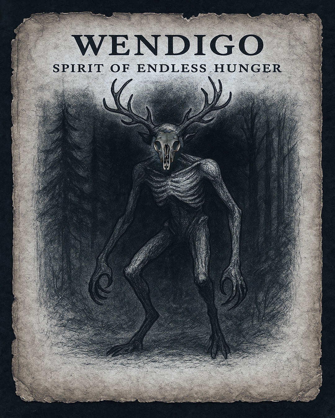 涂鸦中的生物是名叫温迪戈(Wendigo)起源于北美原住民民俗,是一种被认为对人肉有着永无止境的饥渴的生物。它主要出现在美国和加拿大阿尔冈昆印地安人以及五大湖地区其他原住民的传说中。温迪戈通常被描绘成一个骨瘦如柴的巨人,在偏远的森林中徘徊,搜寻猎物。